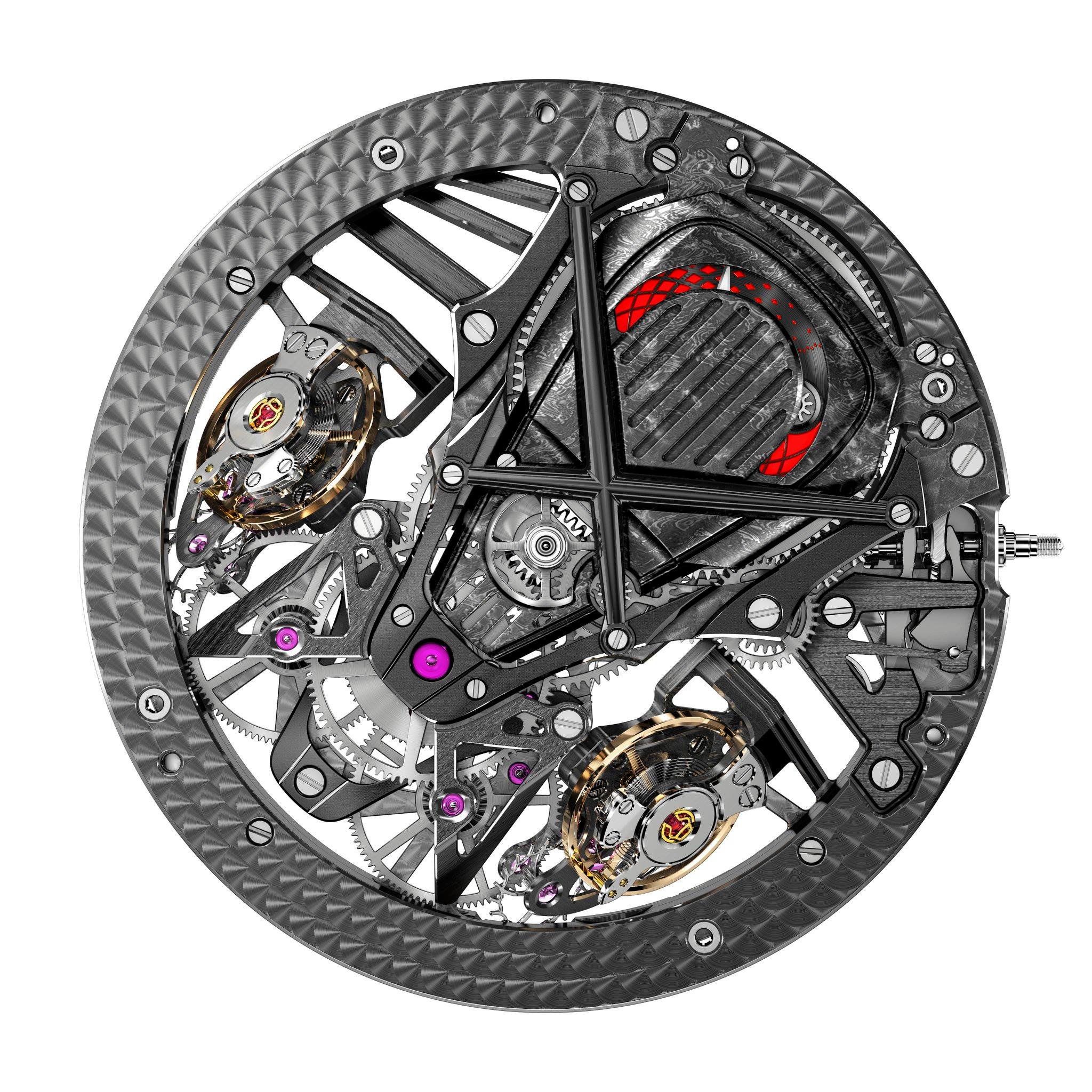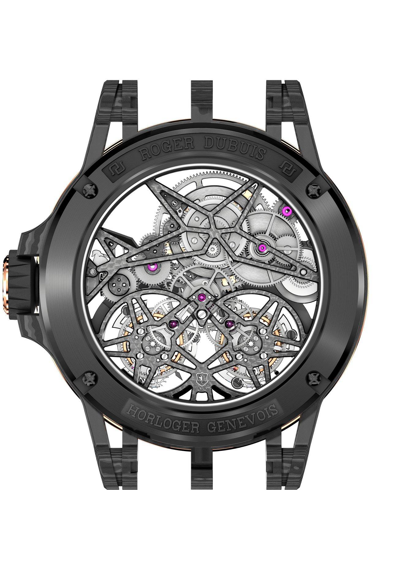 Su nombre se debe a una inclusión de dos volantes que cooperan entre sí para maximizar la precisión y eliminar los efectos negativos de la gravedad en diferentes ángulos. El desarrollo de esta máquina fue encabezado por Gregory Bruttin, director de producto de la firma, quien también desarrolló el Quatuor hace algunos año, del cual ha adquirido el dominio y expertise para generar este reloj pensado como conceptual, pero que continúa asombrando a los clientes de Roger Dubuis.