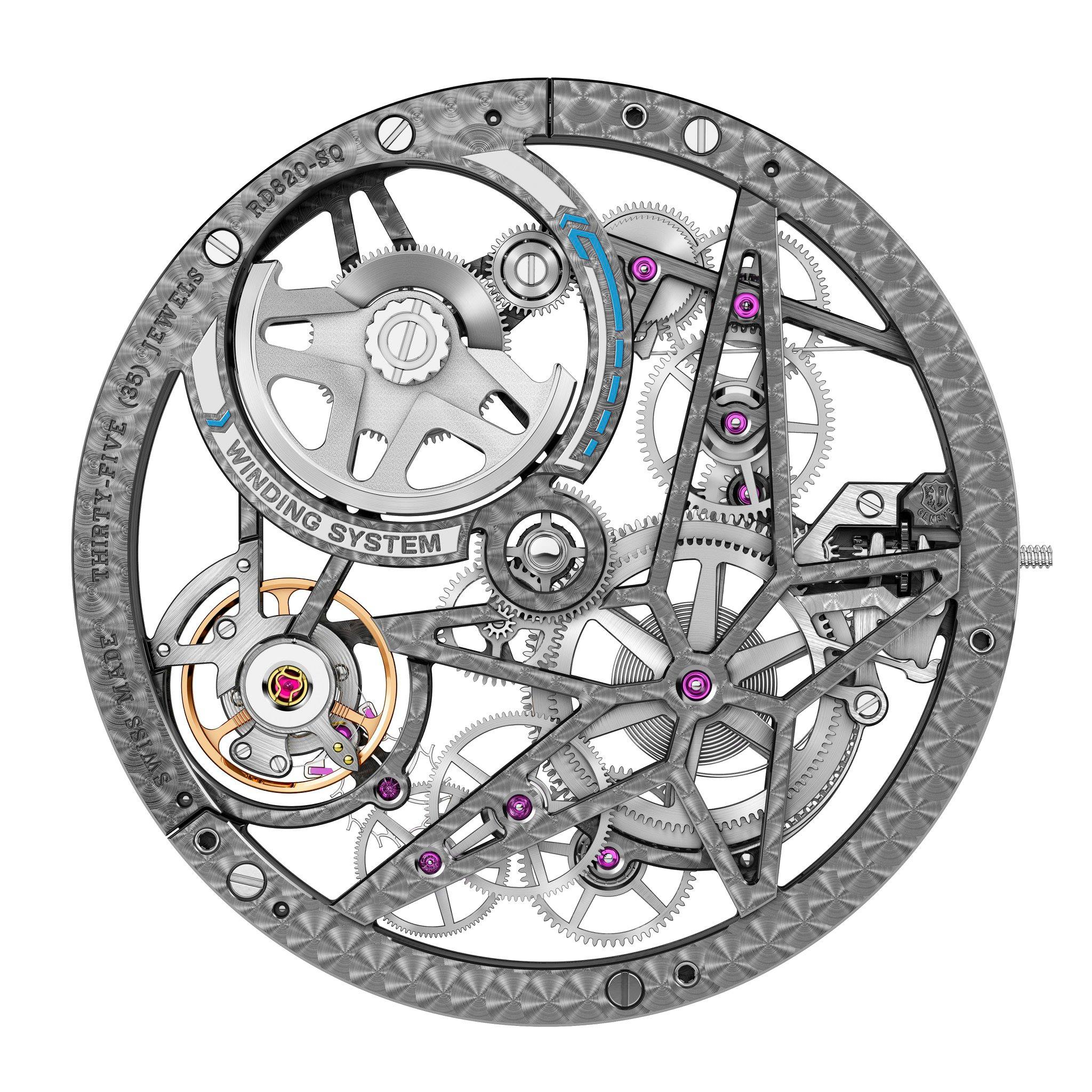 Llama la atención la inclusión de este sistema, que básicamente hace uso de la frecuencia dada, en este caso por dos órganos reguladores conectados pero que vibran a diferente frecuencia. Con ello, la firma menciona que la precisión es máxima, al tiempo que su construcción es excepcional y se apega a los códigos estéticos de la línea Excalibur, es decir, la esqueletización.