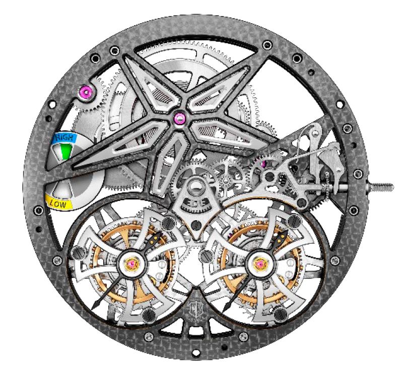 Este duo de relojes se presentó durante la competencia, y del primero podemos mencionar que monta el calibre RD105SQ con doble torbellino volante y trabajo de esqueletización.