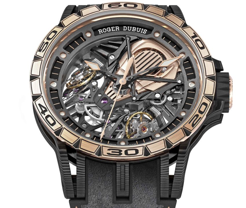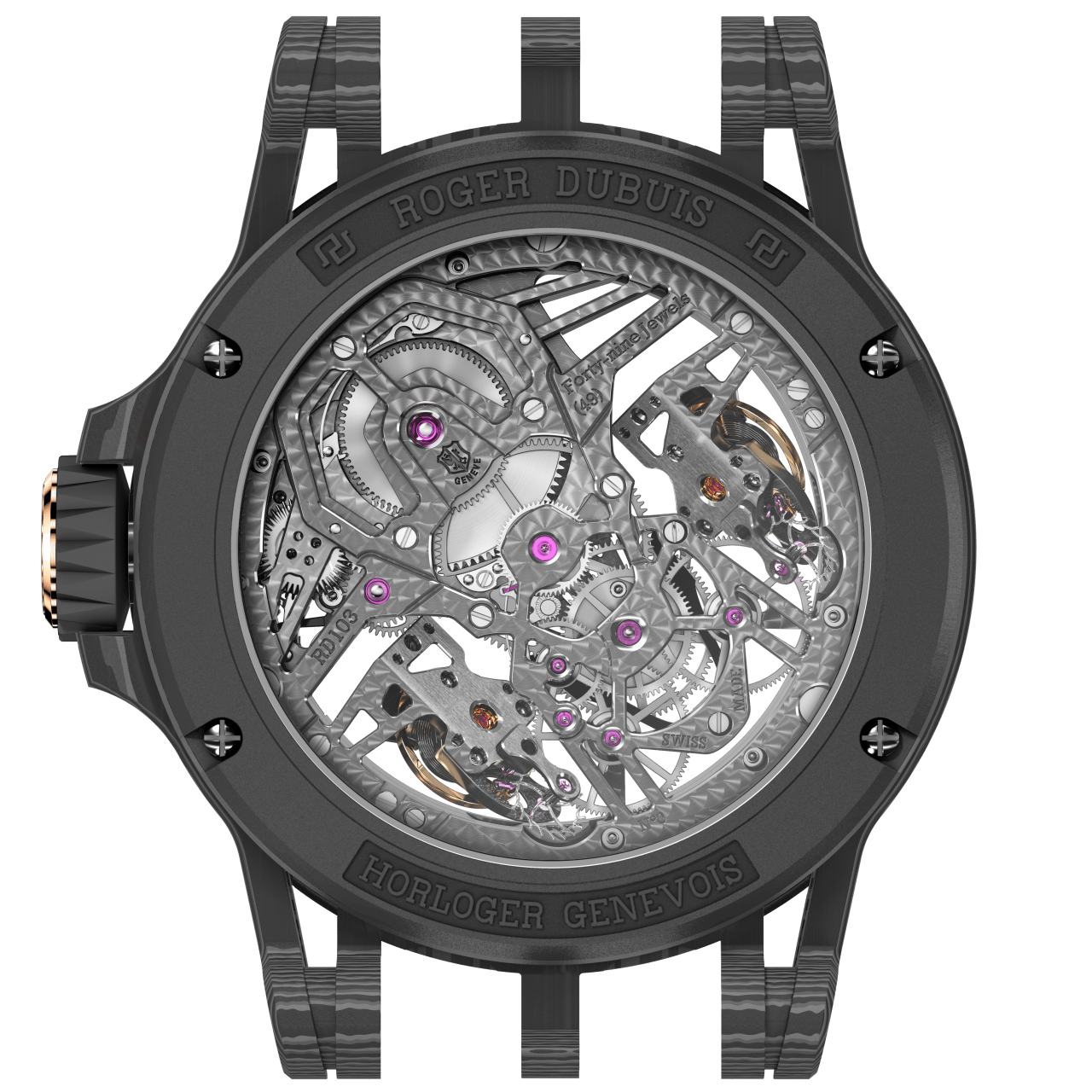 Su caja se extiende hasta los 45 mm de diámetro, está construida en múltiples capas de carbón con carrura de titanio sobremoldeada con caucho negro. El cristal es de zafiro y porta tratamientos antirreflejantes. Asimismo, el bisel acanalado de oro rosa posee índices negros y la corona hace juego a partir de este metal precioso. En su interior vibra el calibre RD103SQ de doble espiral, esqueletizado y con segundero saltante. Posee una frecuencia de 2 X 4 Hz (57,600 alternancias por hora), con autonomía de 40 horas de reserva de marcha y ajuste a 6 posiciones. La limitación de esta pieza es de 28 relojes y posee una correa de caucho negro con incurstación en Alcantara y pespunte dorado motivo Roger Dubuis.