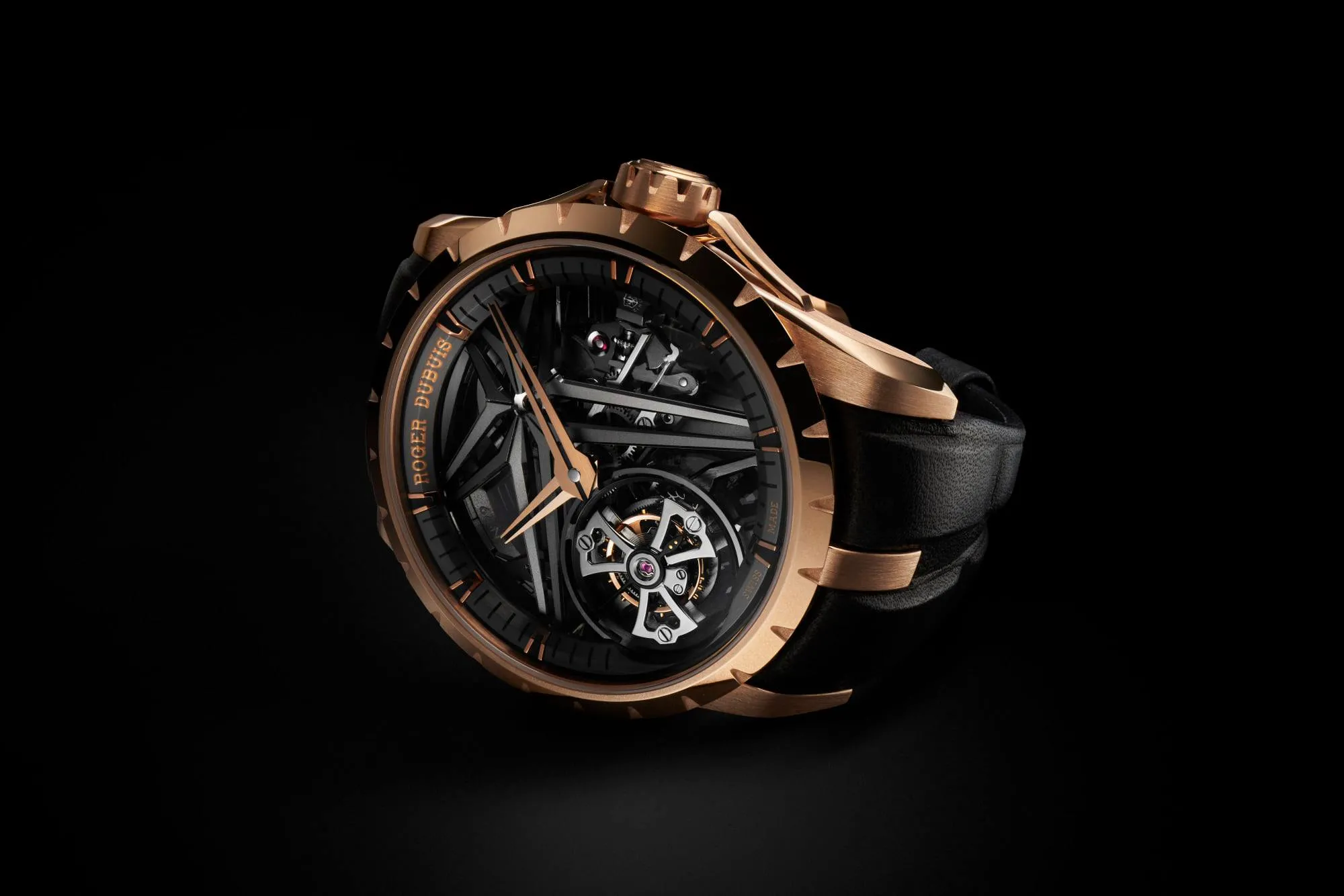 El calibre del nuevo Single Flying Tourbillon se reconstruye de abajo hacia arriba en una hazaña arquitectónica que ve a la estrella Roger Dubuis –ahora– levitar libremente sobre. Se crea una fuerte identidad visual con un patrón característico de dos líneas: visto entre la muesca en la corona y el bisel, los brazos de la estrella, la jaula del tourbillon, la marca de la hora en la brida, las agujas… Esta estética dinámica se ve amplificada por el Poinçon de Genève, que exige la decoración manual de todos y cada uno de los componentes del reloj, así como decoraciones inesperadas y antinómicas en la alta relojería moderna, como la circular. Superficies superiores cepilladas y ángulos pulidos que demuestran el enfoque visionario de Roger Dubuis.