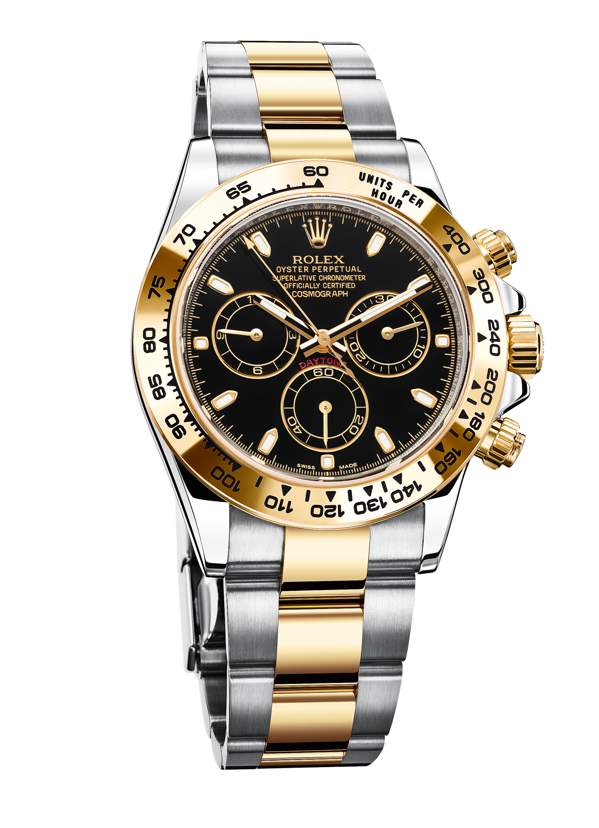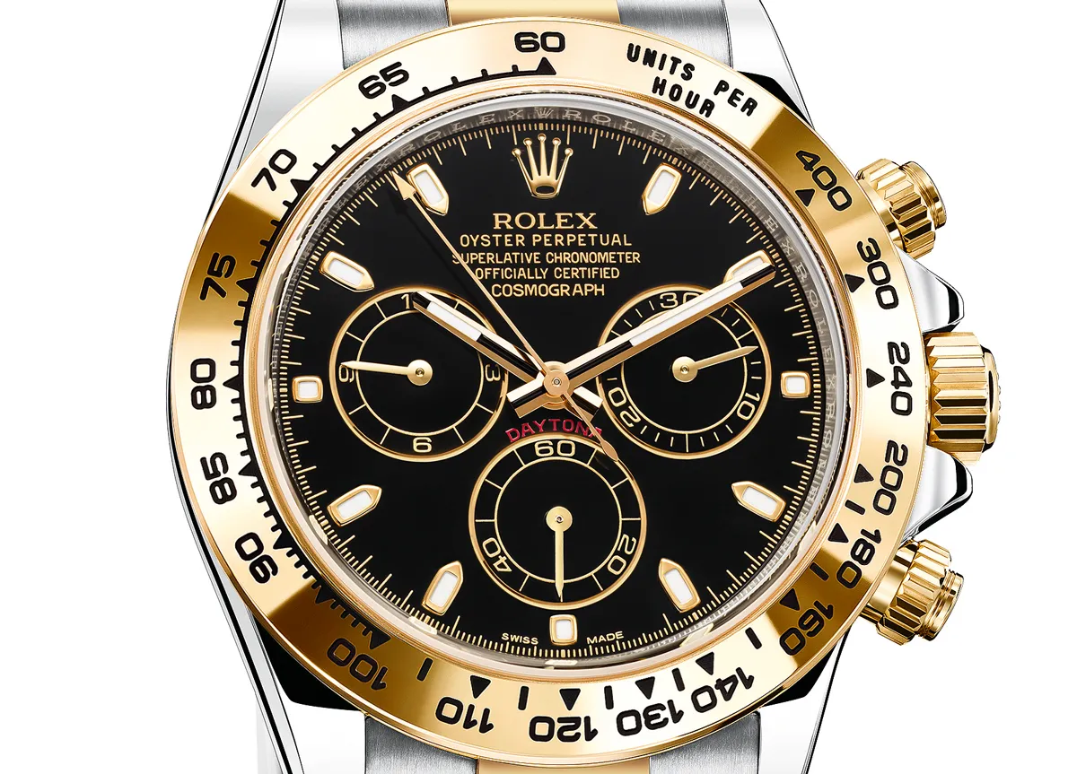 La caja, de acero y oro amarillo, se extiende hasta los 40 mm de diámetro, presenta una arquitectura Oyster y bisel fijo de oro de 18 quilates con escala taquimétrica grabada. En el interior vibra el calibre 4130 de manufactura Rolex, dotado de una espiral azul paramagnética Parachrom y de cuerda automática con remonte bidireccional con rotor Perpetual. Posee una reserva de marcha de 72 horas y posee el certificado de precisión Cronómetro Superlativo, que le garantiza un rate de +2/–2 segundos de desviación diaria. Finalmente se abraza al pulso mediante un brazalete Rolesor armarillo con cierre de seguridad desplegable Oysterlock con cómodo sistema de extensión Easylink de 5 mm. Luce carátula negra y totalizadores en punto de las 3, 6 y 9 horas.