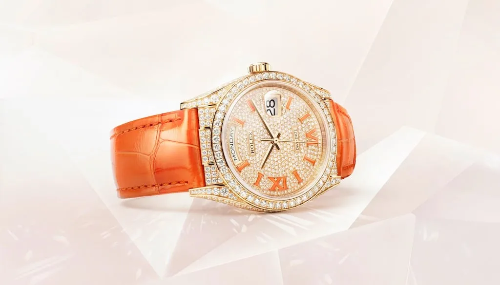 Rolex Day-Date 36 se presenta con tres nuevas referencias llenas de color y de bling, diamantes…Fabricadas respectivamente en oro amarillo de 18 quilates, en oro blanco de 18 quilates y en oro Everose de 18 quilates, estas nuevas modalidades están cubiertas de diamantes y provistas de una correa de piel de cocodrilo con acabado pulido.