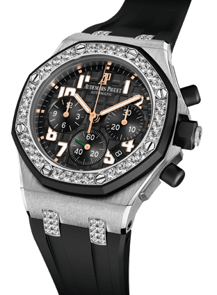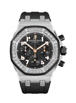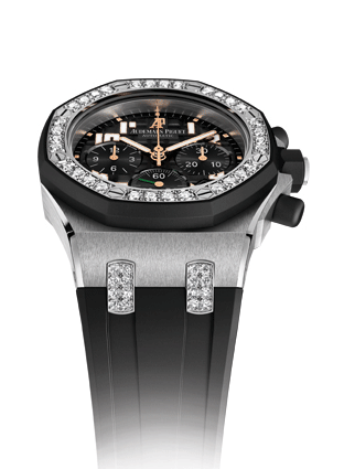 Audemars Piguet nos presenta el Royal Oak Offshore Ladycat, un cronógrafo de cuerda automática con indicación de la fecha y segundero pequeño a las 6 horas. Movimiento con cronógrafo integrado, mecanismo de cronógrafo con rueda de columnas.