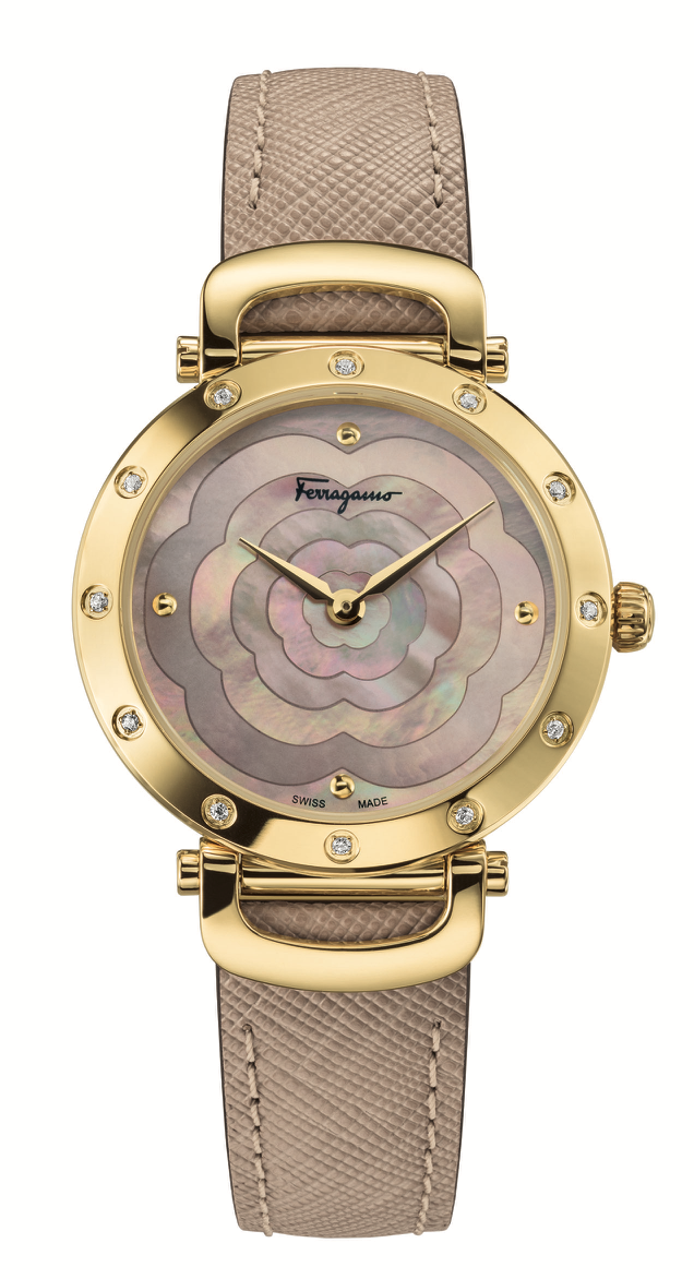 Con una flor que habita en la carátula, Ferragamo Style es el reloj que brilla a través de pequeños diamantes incrustados en la caja de 34 mm de acero. Disponible con brazalete de cuero safffiano en color nude, negro, azul oscuro, rojo o con malla de acero, este modelo, simplifica la elegancia en puntualidad.