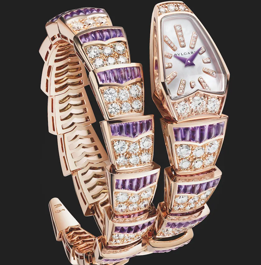 Bvlgari, el maestro romano de gemas de colores, reinventa y añade un nuevo concepto a tres relojes icónicos de la línea Serpenti bajo la belleza de la amatista púrpura.