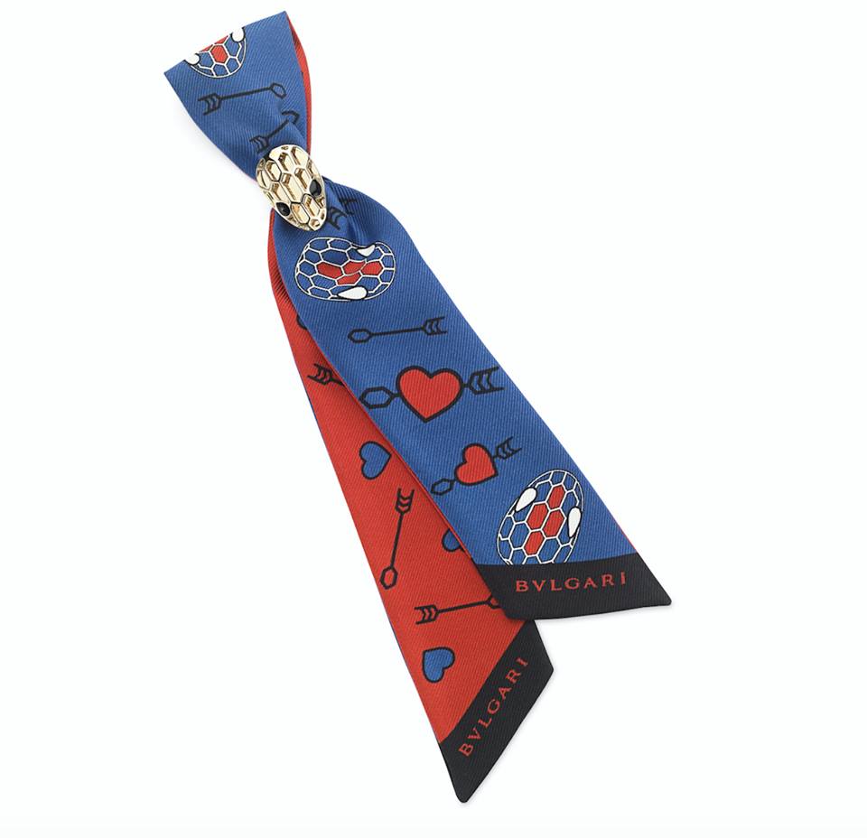 La estola Shelley de seda diseñada con corazones, flechas y la icónica cabeza Serpenti estará disponible Jaspe Carmín o Turmalina Colbato.
