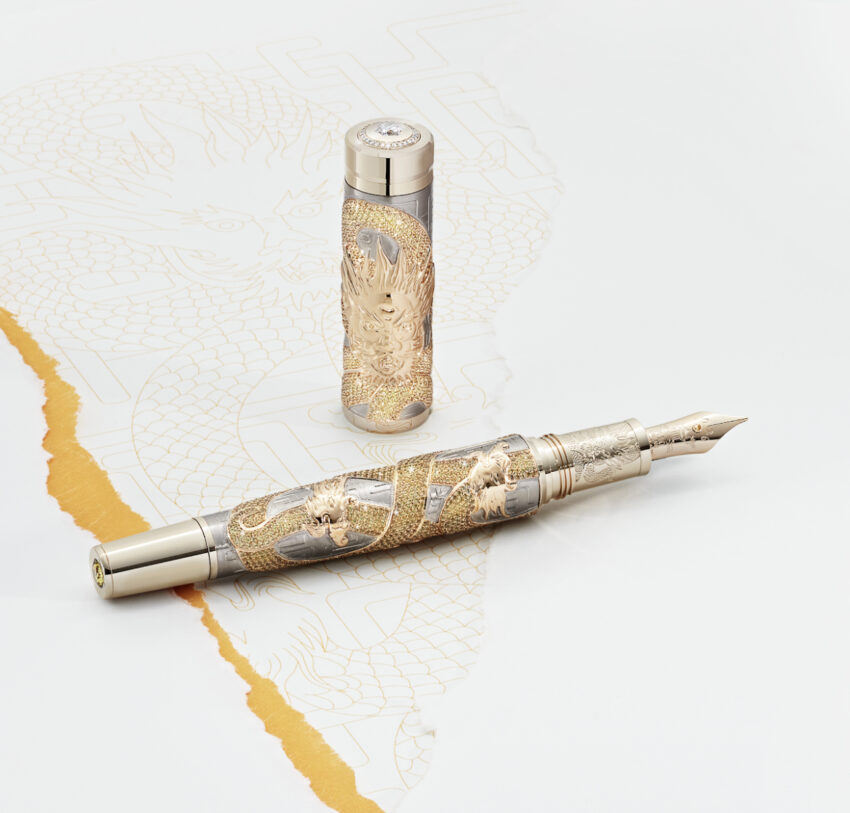 El cuerpo del dragón esta embellecido con diamantes de talla brillante en las alas, y topacio azul en los ojos, así como detalles en oro macizo Au750. El cono y el plumín están decorados con sendos zafiros azul claro. En el plumín aparece también el carácter hong, que representa el fin de las lluvias. El capuchón ostenta un diamante con la forma del distintivo de Montblanc rodeado de diamantes talla brillante. La magnificencia de esta pieza no necesita multiplicación, así que es una edición limitada a solo 8 piezas.