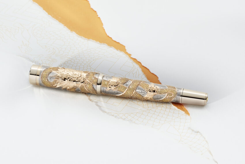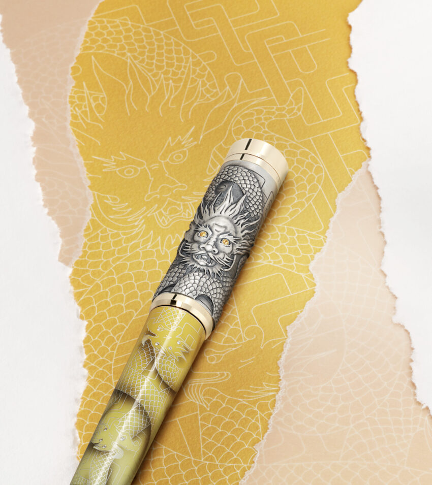 La colección se completa con una pieza que muestra la indiscutible maestría artesanal y técnica del Artisan Atelier de Montblanc. El dragón alado Edición Limitada 8 muestra a cabalidad la figura tridimensional de este mítico réptil grabado completamente a mano. El cuerpo abarca tanto el capuchón como el barrilete, hecho en oro blanco macizo Au750. Está decorado con tsavoritas verdes, turmalinas azules de Paraiba y varios topacios azules que sobresalen sobre el fondo grabado con nubes que remiten a su cualidad de dominar los cielos.
