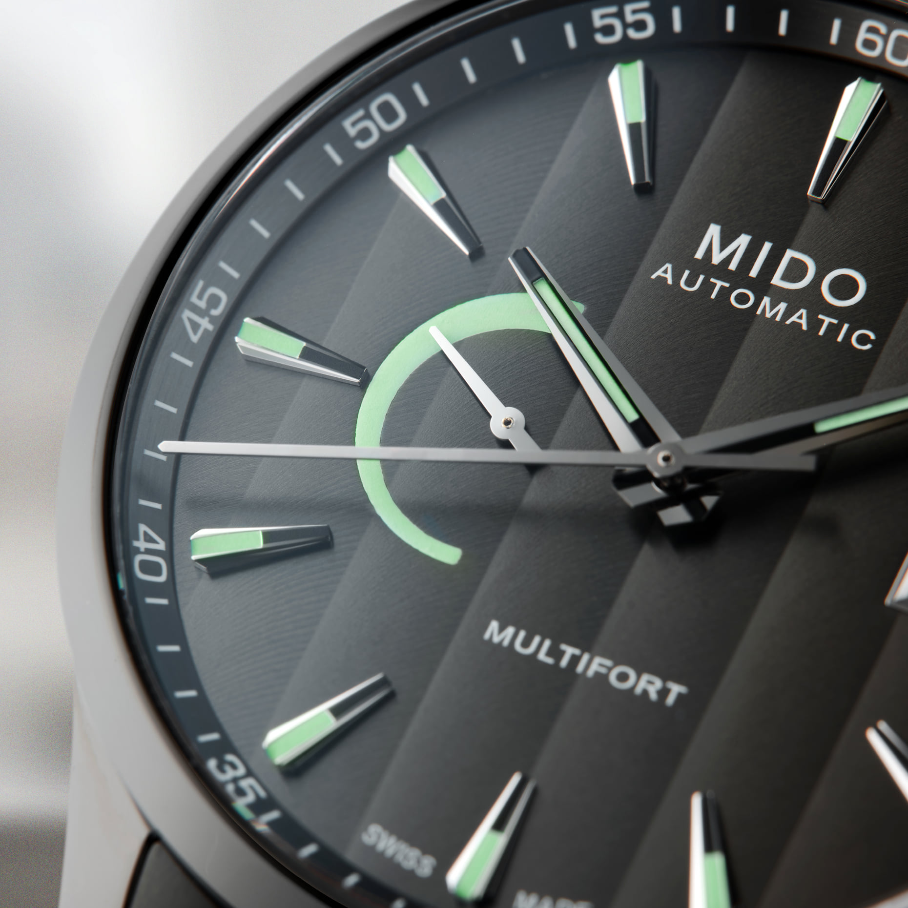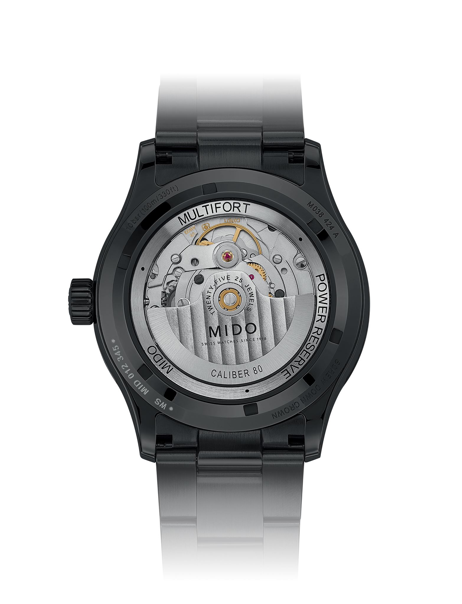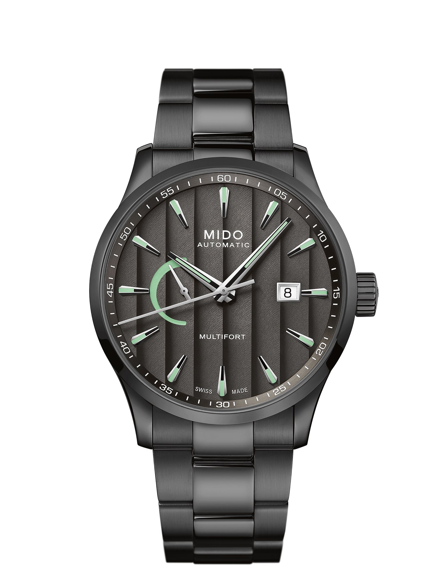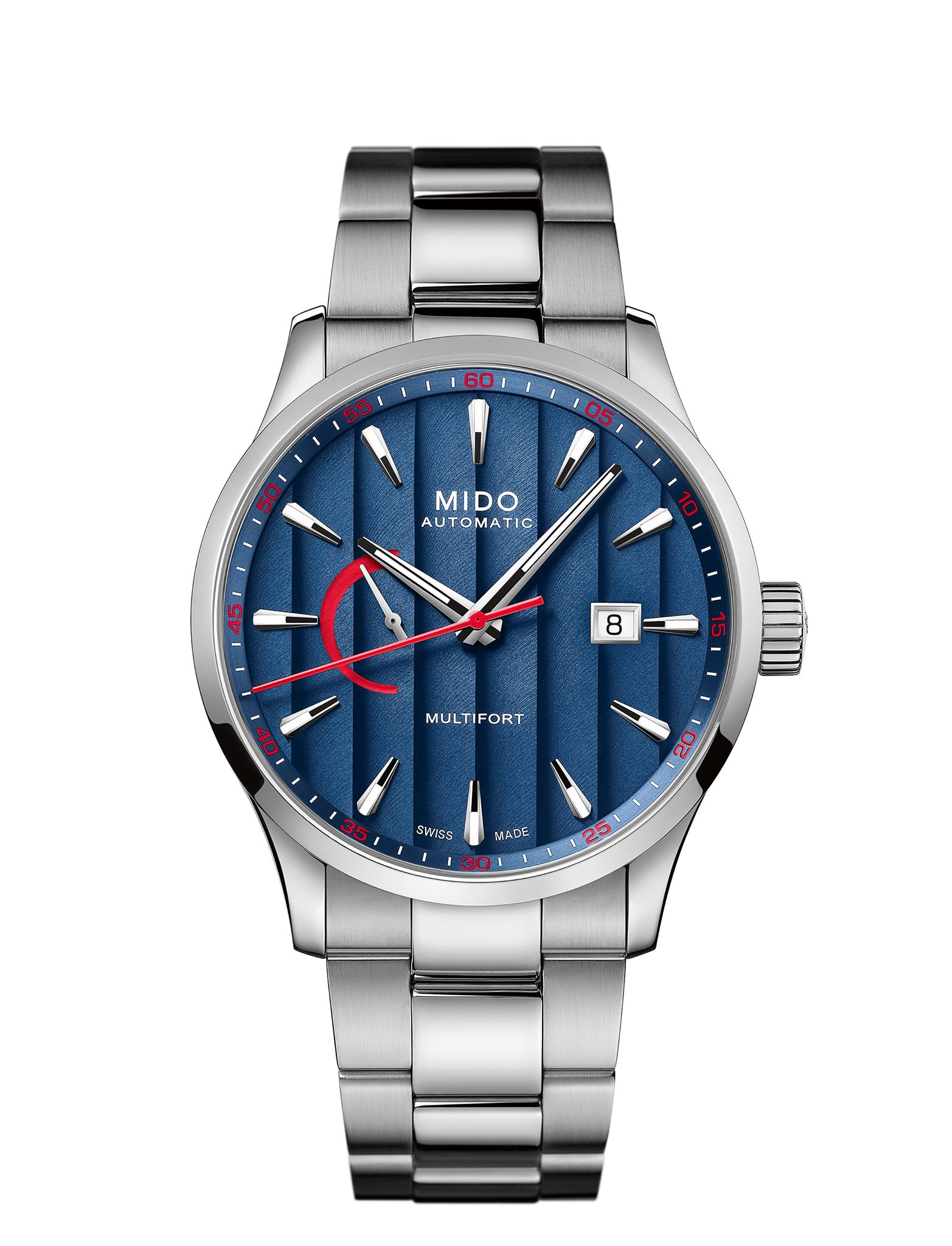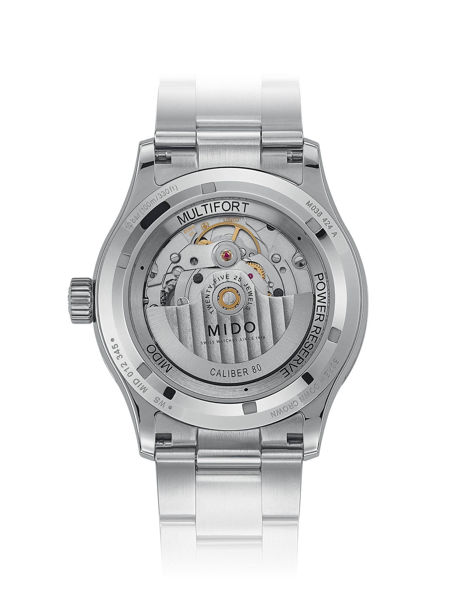Mido muestra la autonomía excepcional del Calibre 80 en la carátula del Multifort. Al tiempo que una apertura en la carátula muestra el fechador a las 3 en punto, ofreciendo una función diaria muy práctica. El cristal de zafiro con un tratamiento anti reflejante en ambos lados ofrece una vista completamente clara de la carátula y agrega un toque de sofisticación.