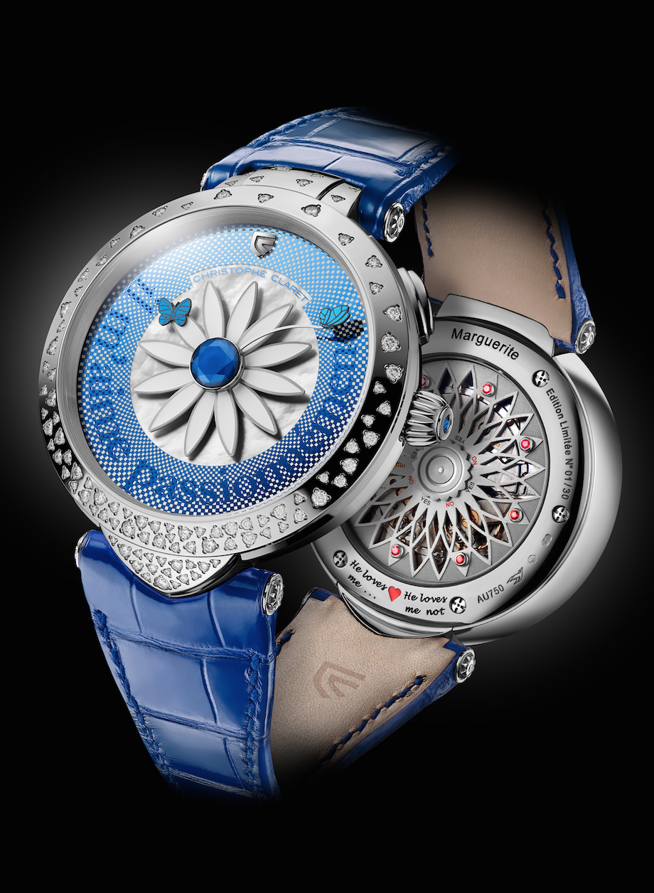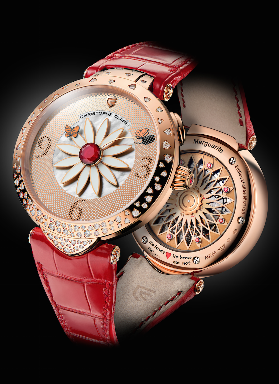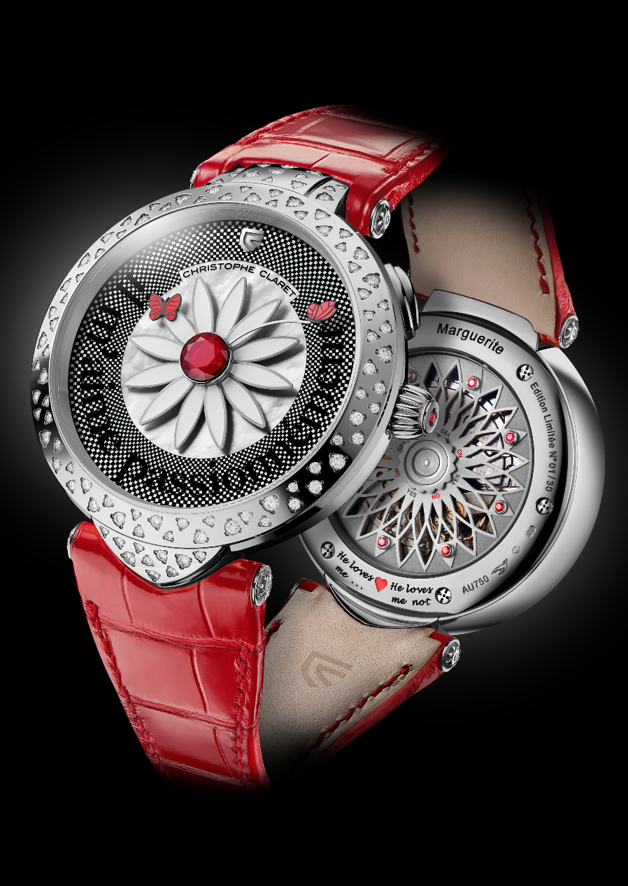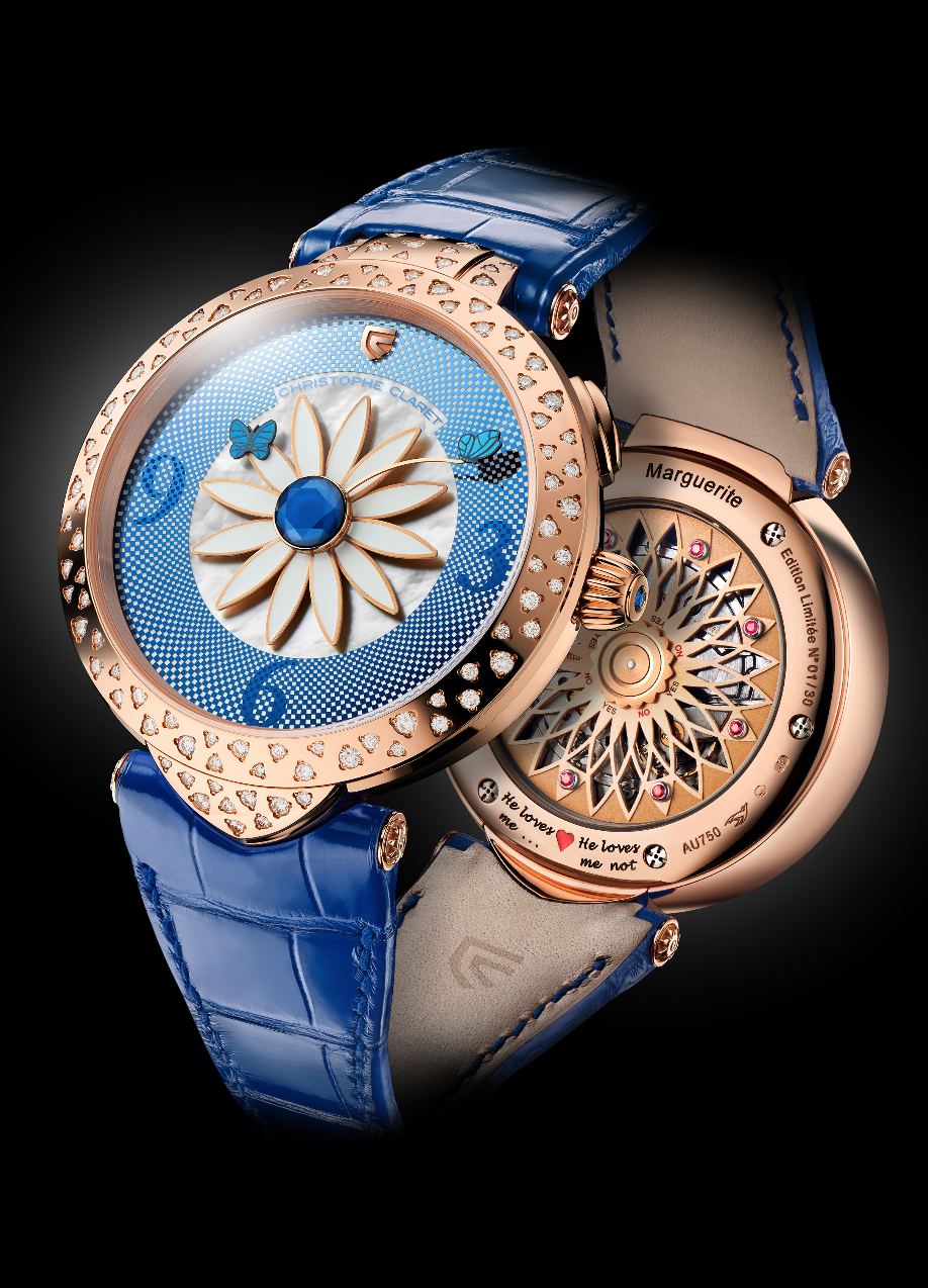 Marguerite: horas y minutos indicados por dos mariposas volando sobre la carátula. Diferentes configuraciones con un mensaje completamente configurable por el cliente en la carátula.