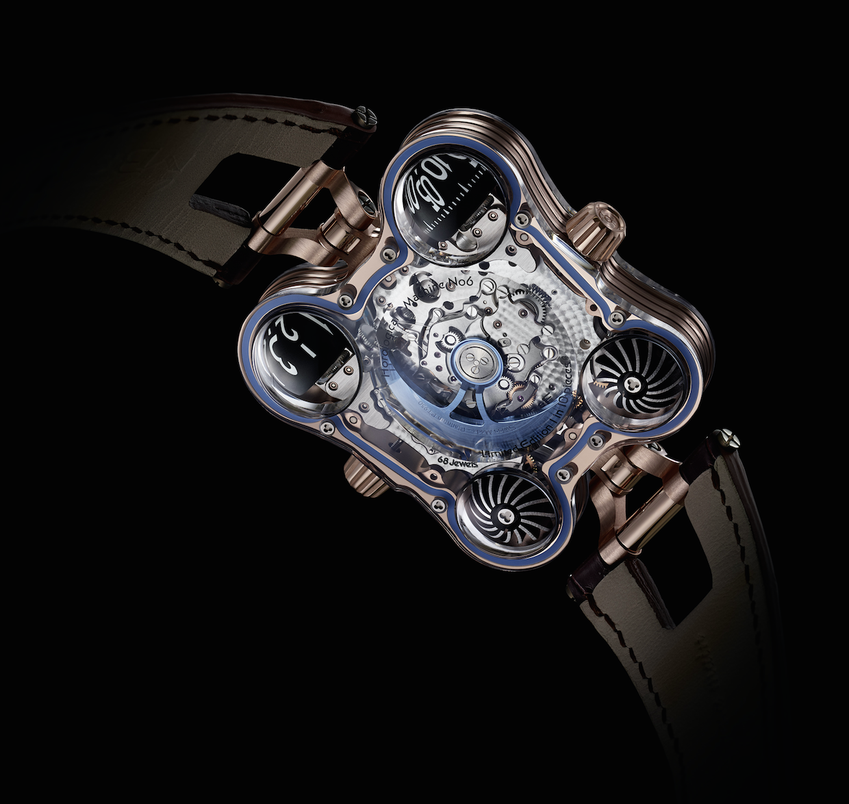HM6 Space Pirate: horas y minutos al frente, dos turbinas reguladoras y un torbellino al centro, que además aparece a demanda. El movimiento es sumamente complejo, por lo que este año lanzan: Streamline Moderne, inspirado en las líneas aerodinámicas de los camiones y la industria de la movilidad. Caja de zafiro con el cinturón streamline moderne en oro rosa. 350 horas de trabajo (2 meses) para la construcción de la caja. 10 en oro rojo y 10 en platino.