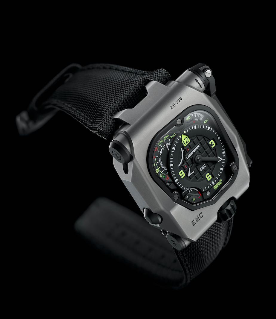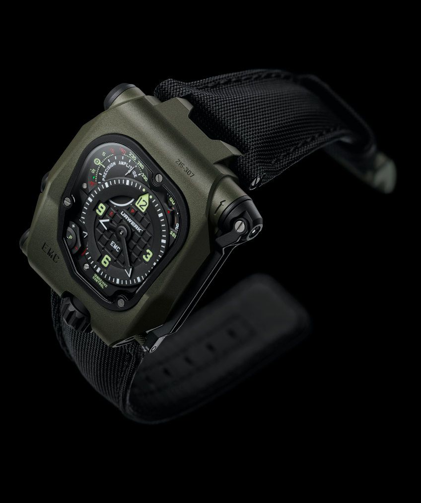 EMC: un dispositivo electrónico para medir el desempeño del reloj, pero por primera vez también la amplitud del órgano regulador (hecho en casa) gracias a un sensor óptico conectado a una computadora que mostrará las informaciones en la carátula. Cajas de titanio y acero, y uno más hecho de cerámica especial, un material específicamente utilizado en la milicia. Edición limitada a 20 piezas cada uno.