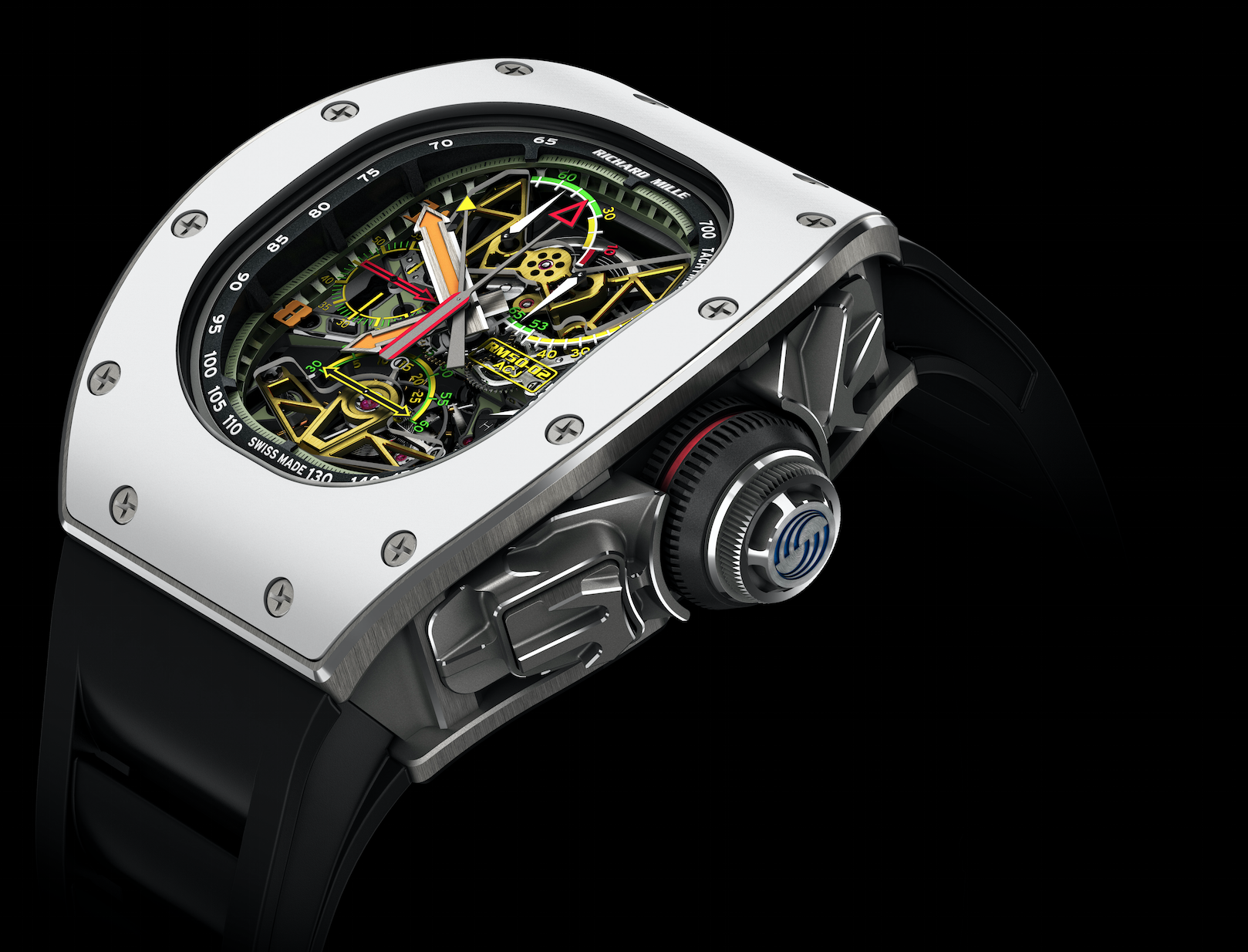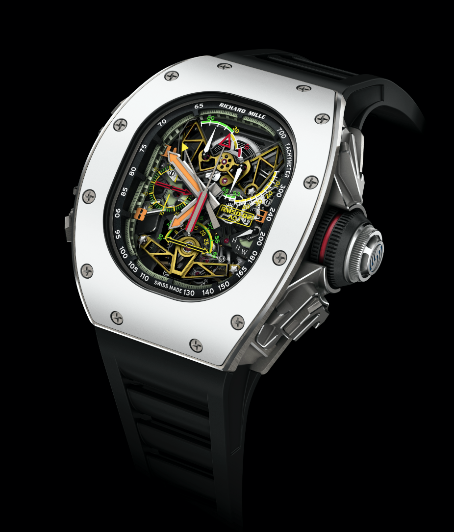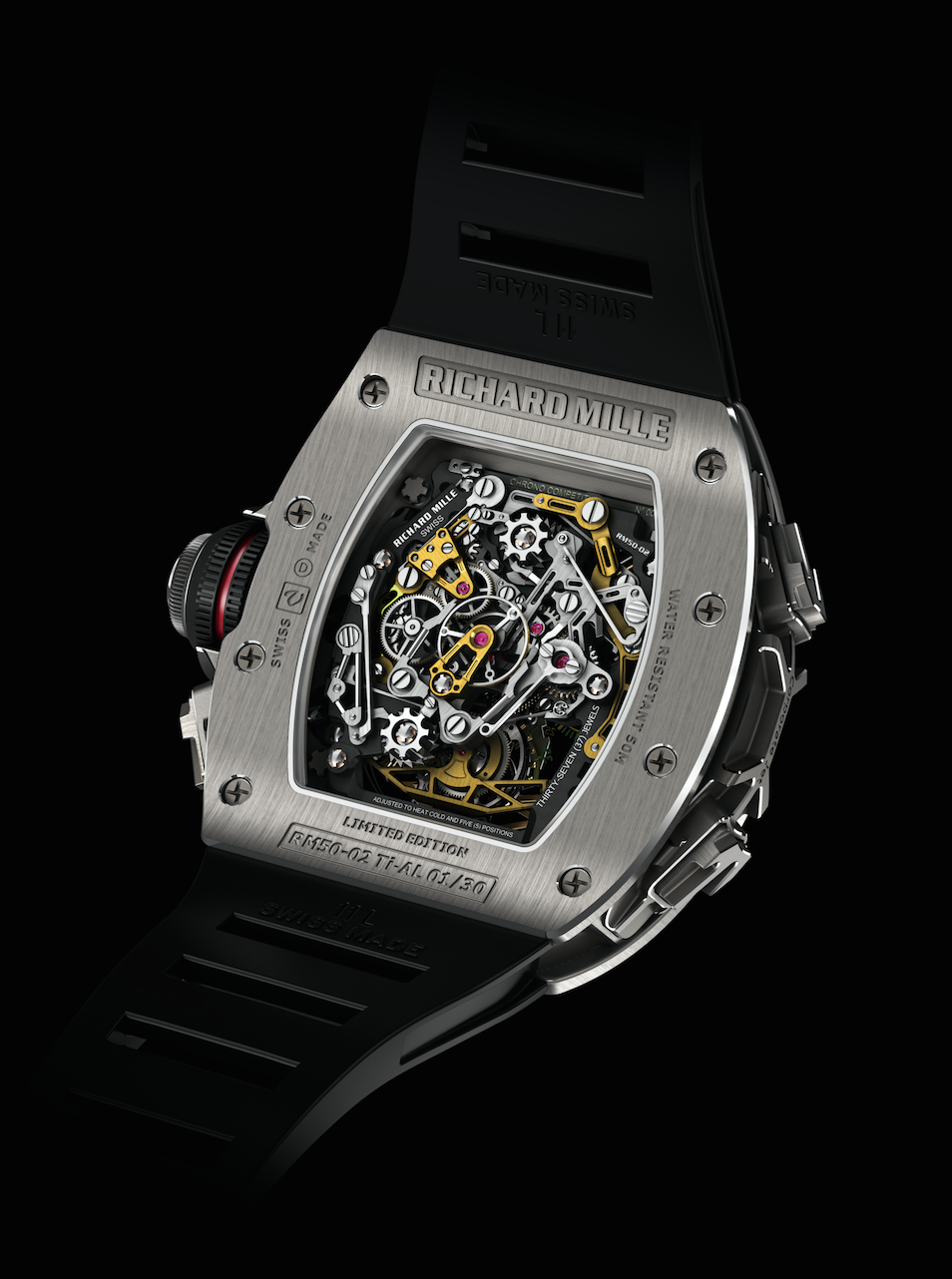 Movimiento tourbillon de cuerda manual con indicación de horas, minutos y cronógrafo con rattrapante (start – stop y reset, mientras sobre la corona se manipula el rattrapante) cuenta con contador de de segundos, e indicador de par. Caja de 50 mm x 42 mm hecha de titanio aluminio TiAI, utilizado en la aviación, el canto también se inspira en esta disciplina. 50 horas de reserva de marcha y frecuencia a 3 Hz.
