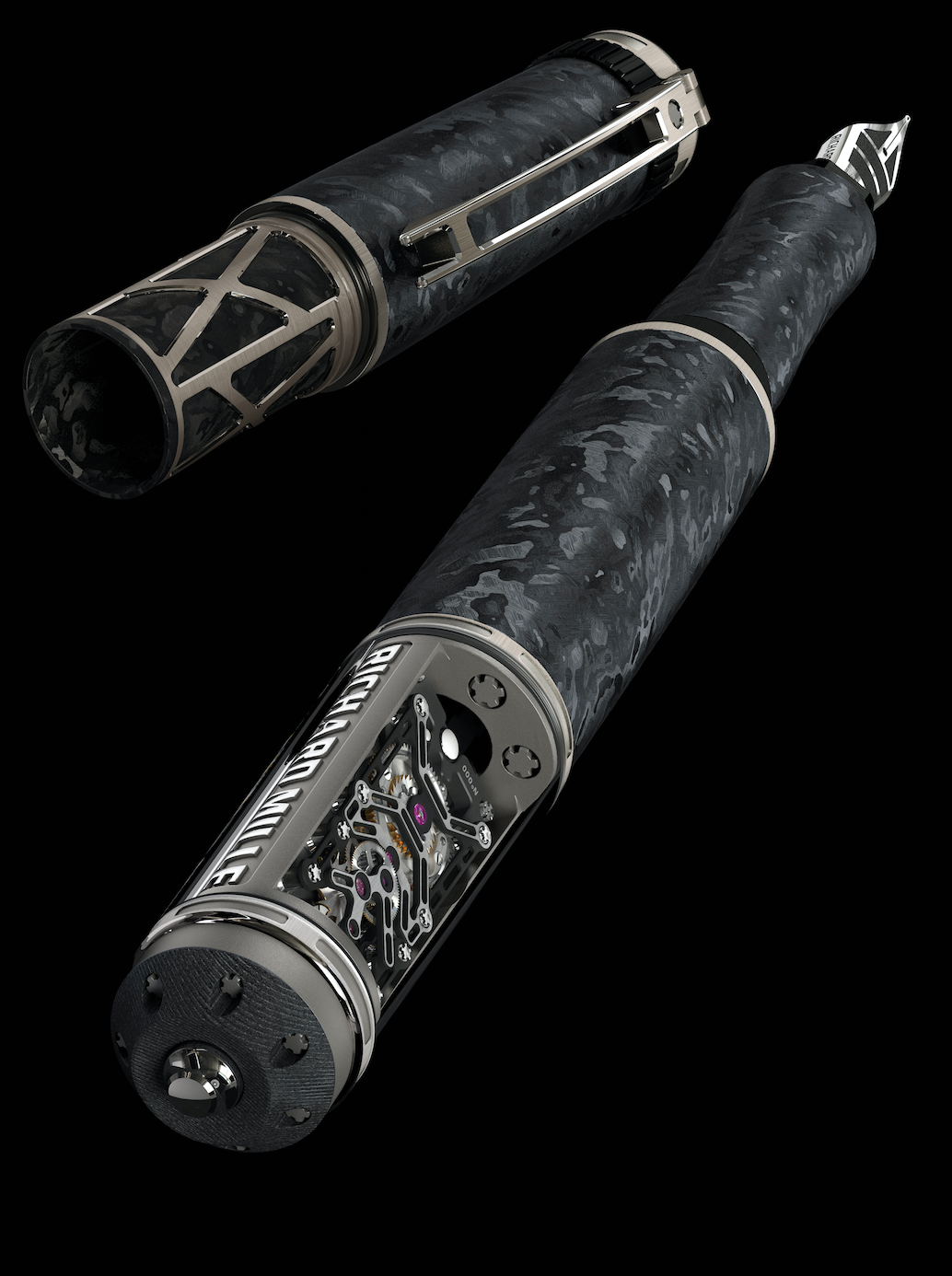Hecha de carbono en NTPT, tejido en finas capas a fin de endurecerse y preservar su estructura con el paso de los años. Su movimiento está inspirado de un órgano regulador de sonería, y permite ingresar o liberar el plumín. Hecho en puentes esqueleto de titanio grado 5. Por la parte trasera del capuchón se desenrosca el plumín del cuerpo de la pluma para cambiar el cartucho.