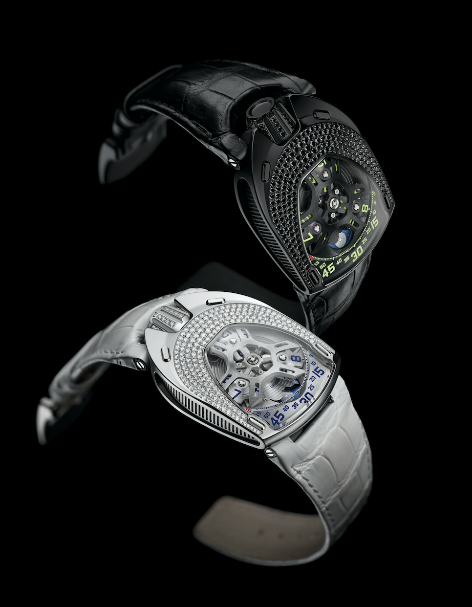 UR-106. Por vez primera lanzan un reloj para mujeres. Desvelan un homenaje a la belleza de la mujer. Las horas satélites coinciden con los minutos lineales al extremo de la corona, mientras que un disco exhibe la fase Lunar en punto de las 6 horas. Edición limitada a 25 ejemplares: negro y blanco.