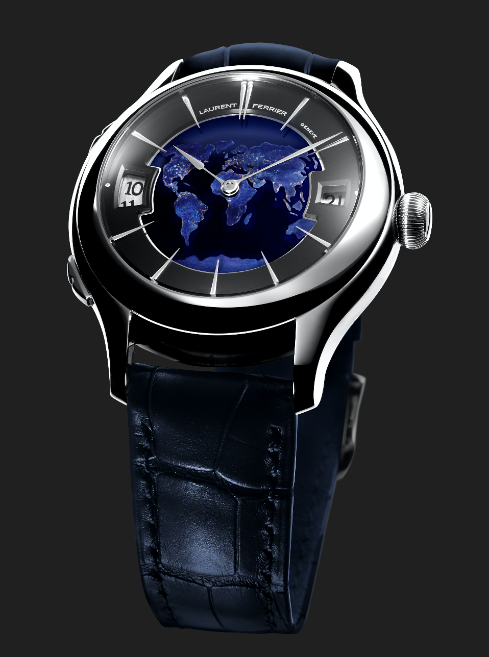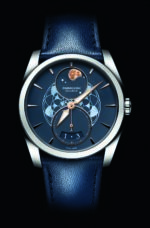 Con la intención de desarrollar un instrumento real para viajeros, se lanza un GMT con función de horas mundiales: desde la corona se controla –de manera bidireccional– la hora local, el GMT y la acción de carga, mientras que la fecha se indica en la periferia y la esfera se modifica en color beige, para el día, y azul para la noche.