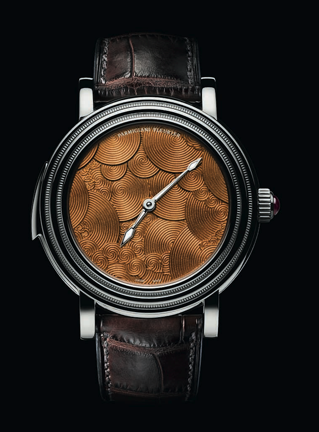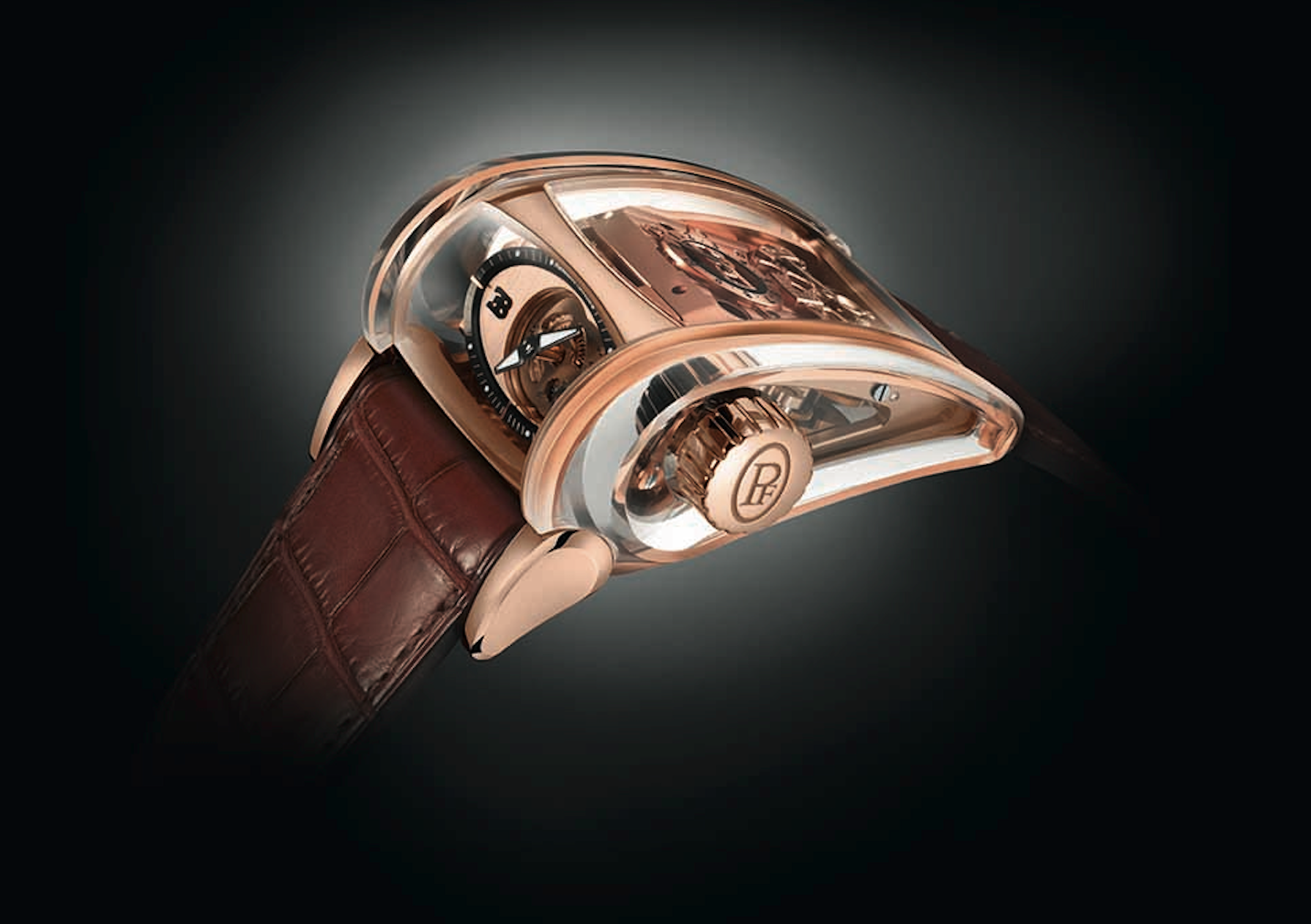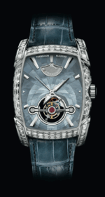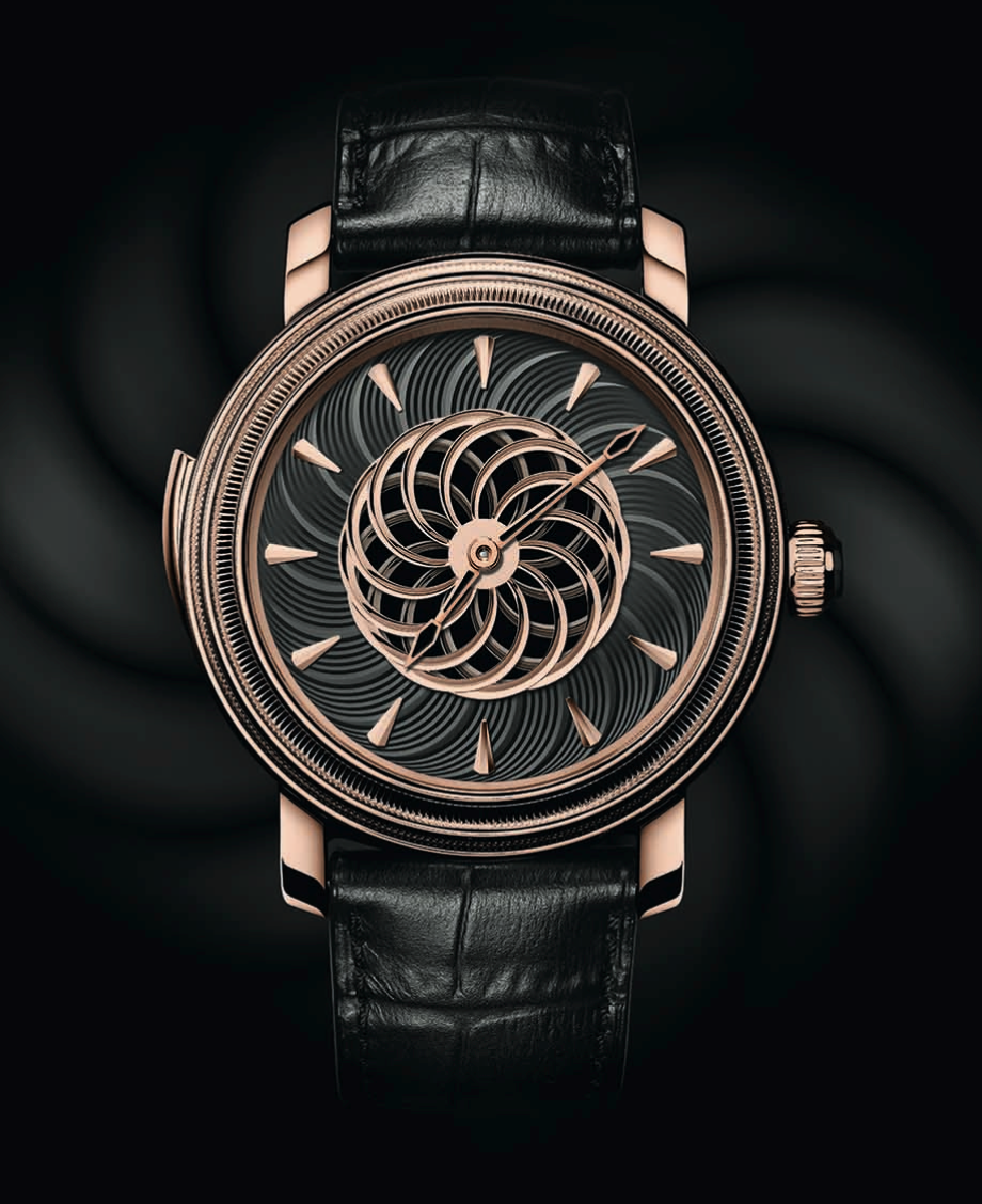 Se viste de oro blanco. En principio su caja fue hecha de platino y luego en oro rosa. El gran desafío era distribuir las informaciones de forma simple, por lo que el torbellino se esconde en la parte trasera.