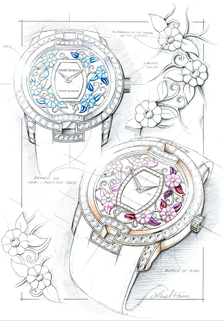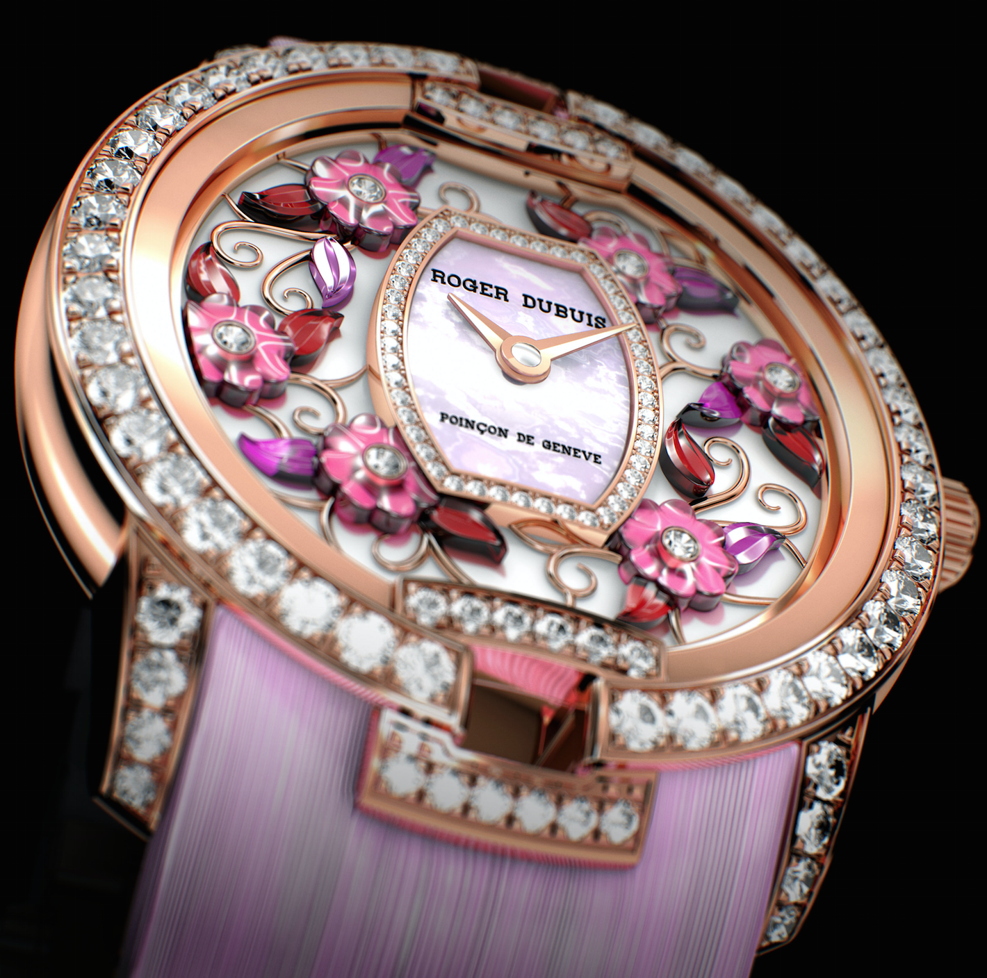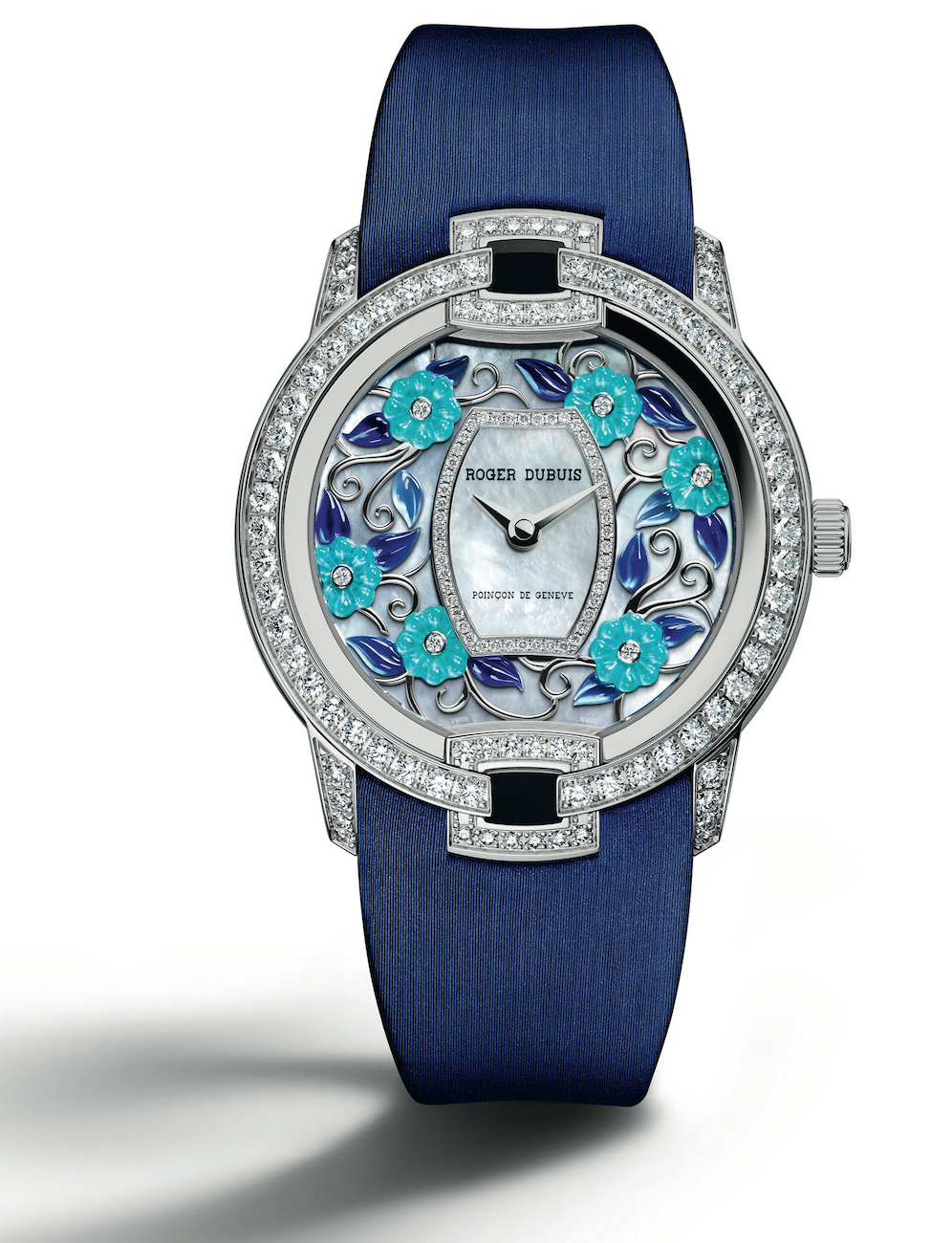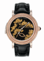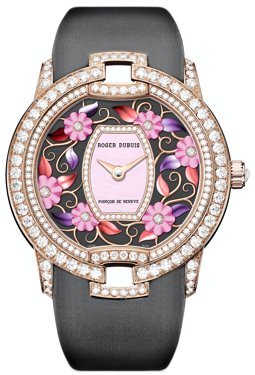 Velvet Blossom: creatividad y misterio. Se logra un relieve en la carátula gracias a la utilización de grabado a láser con esmalte gran fuego sobre madreperla. Con ello se consigue un efecto en tercera dimensión. Exhibe engaste de diamantes para la caja.