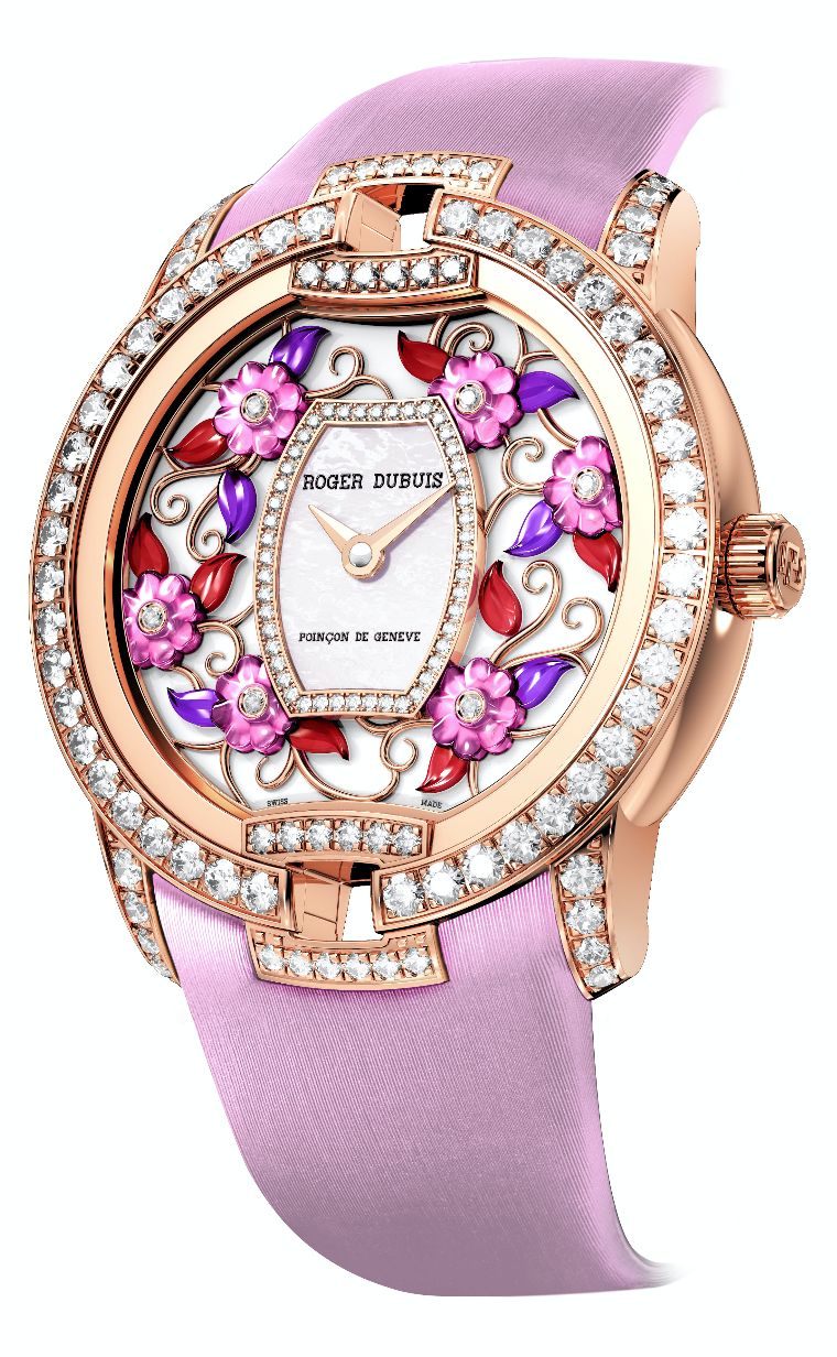 Velvet Secret Heart: un tributo a la mecánica, que consiste con la predilección de Roger Dubuis por la complicación bi-retrógrada. La fecha se muestra en la periferia de la pieza, dividiendo el mes.