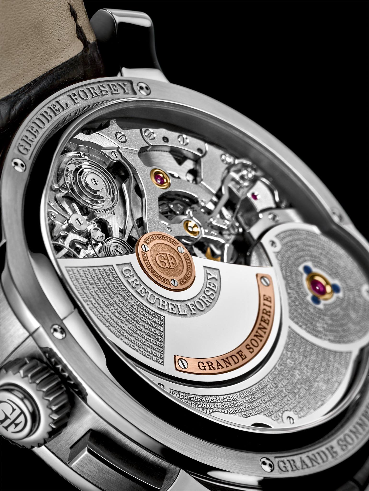 Adicionalmente se puede seleccionar el modo de repetición de minutos, y esta integración en el mismo guardatiempo ha sido un hito. Timbres catedral y los martillos están finamente decorados, por la apertura lateral con cristal de zafiro se pueden observar los timbres catedral y el torbellino. Dos reservas de marcha, a la derecha para la sonería (20 horas para la Grande Sonería), y la otra reserva es para el movimiento. Tres barriletes: 2 para el funcionamiento del reloj con tourbillon y uno más exclusivo para el sistema de sonería.