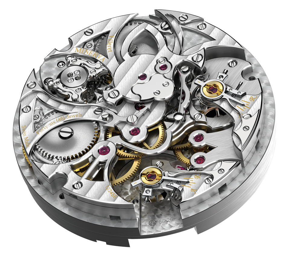Este motor goza de dos corazones que laten a diferentes frecuencias: 18,000 y 360 mil alternancias por hora, dos fuentes de energía (100 horas de autonomía para el reloj y 45 minutos para el crono), y un accionamiento de crono monopulsante.