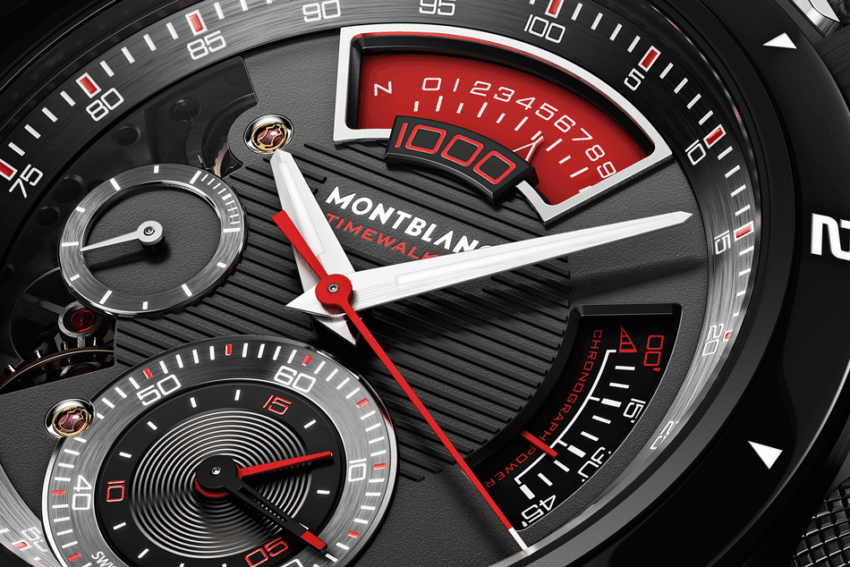 El Montblanc TimeWalker Chronograph 1000 Limited Edition 18 es sorprendentemente fácil de leer ya que sigue un patrón conocido que se encuentra en la gran mayoría de los cronógrafos. El doble contador a las 6h cuenta con una larga aguja de punta roja para el registro de los segundos transcurridos de 1 a 60, así como una aguja corta completamente roja para contar un máximo de 15 minutos transcurridos. Los indicadores del cronógrafo comienzan con una aguja roja, centrada axialmente, para las centésimas de segundo transcurridas que completa una rotación entera de 360° cada segundo, de modo que su punta hace un sprint alrededor de la escala de las centésimas de segundo del perímetro de la carátula. Las milésimas de segundo se indican a las 12h en un “cartouche” inspirado en el velocímetro del tablero de instrumentos de los coches vintage, donde un indicador rojo triangular avanza a lo largo de una escala calibrada de 0 a 9. La posición de reposo se indica mediante la letra “N” (de neutro), dejando el 0 para indicar las milésimas con claridad, es decir, una centésima de segundo completa. Solo 18 piezas de este reloj están disponibles, y estaremos pendientes de conocer la cifra de relojes que entregará Montblanc a nuestro país, por supuesto.