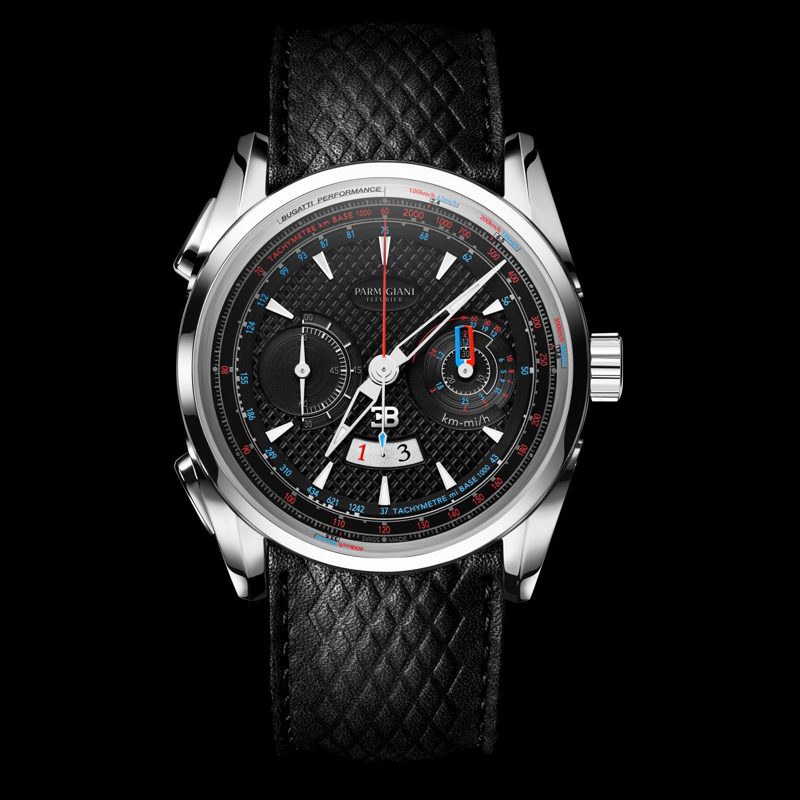 Un reloj inspirado en el mítico bólido, y que ha sido completamente rediseñada en la carátula gracias a un formato a láser con patrón de diamante invertido. En el dial se presentan los colores rojo y azul, en millas y kilómetros, con las mediciones del Bugatti más rápido del mundo: 0-100 km/h; 0-200 km/h; 0-300 km/h y 0-400 km/hora. Además los contadores con forma de media Luna. El calibre es un PF 335, de remonte automático con función flyback. La correa replica el patrón de la carátula, que a su vez se inspira en los asientos de los Bugatti más emblemáticos.