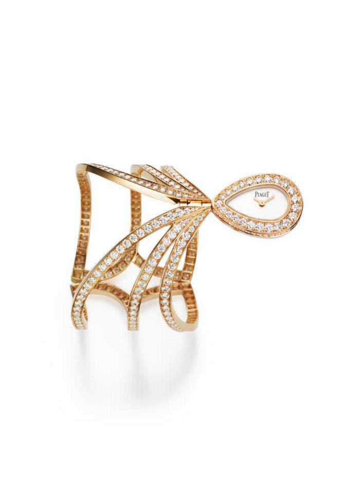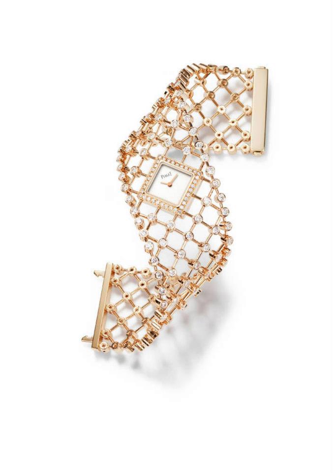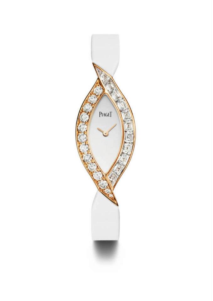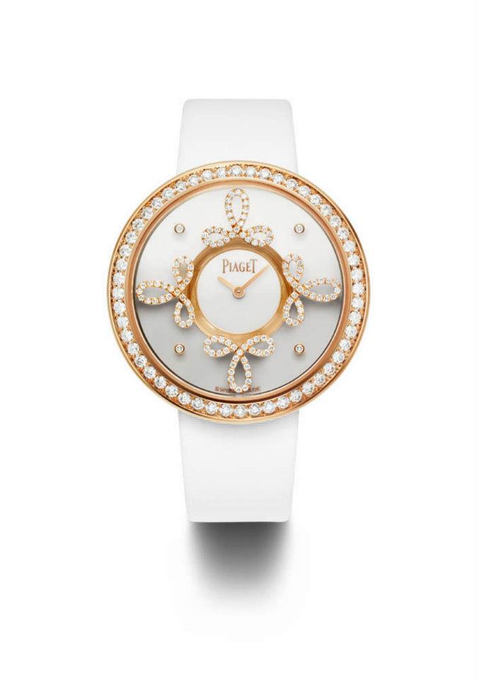 - Limelight Dancing Light en oro rosa engastado en 206 diamantes corte brillante. Carátula blanca, correa de satén blanco. Movimiento cuarzo Piaget 56P.