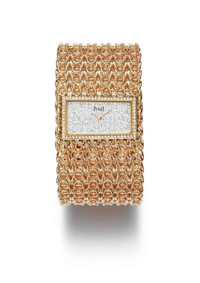 - Reloj-brazalete de oro rosa trenzado, engastado en 400 diamantes corte brillante. Movimiento de cuarzo Piaget 56P.