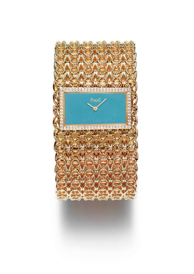 - Reloj-brazalete en oro rosa trenzado, engastado en 69 diamantes corte brillante. Carátula de turquesa. Movimiento cuarzo Piaget 56P.