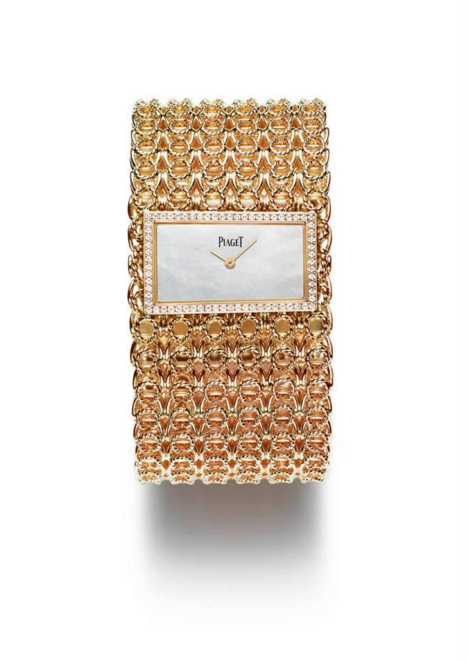 - Reloj-brazalete en oro rosa trenzado, engastado en 69 diamantes corte brillante. Carátula en madre perla. Movimiento cuarzo Piaget 56P.