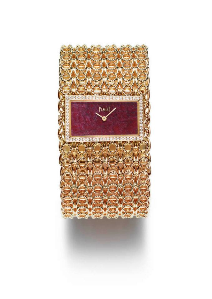 - Reloj-brazalete en oro rosa trenzado, engastado en 69 diamantes corte brillante. Carátula de rubí Movimiento cuarzo Piaget 56P.