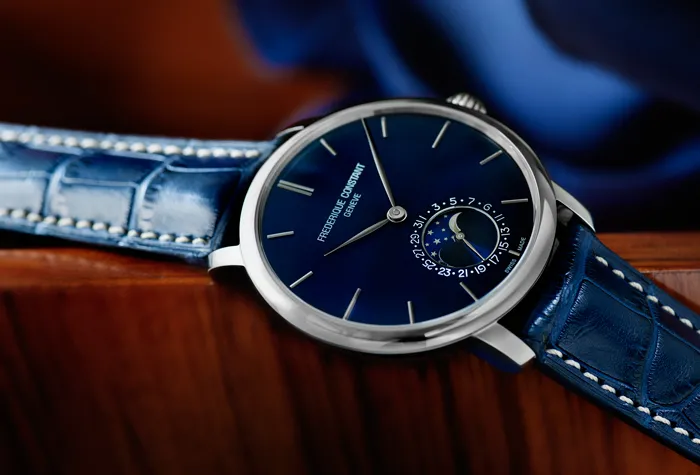 Slimline Moonphase Manufacture // Referencia: FC-705N4S6 / Calibre: FC-705 de manufactura / Movimiento: mecánico automático / Funciones: horas, minutos; fechador y fases de Luna / Caja: 42 mm de acero inoxidable pulido / Cristal: zafiro convexo y fondo de cristal de zafiro / Corona: a las 3 h ajustable en tres posiciones
