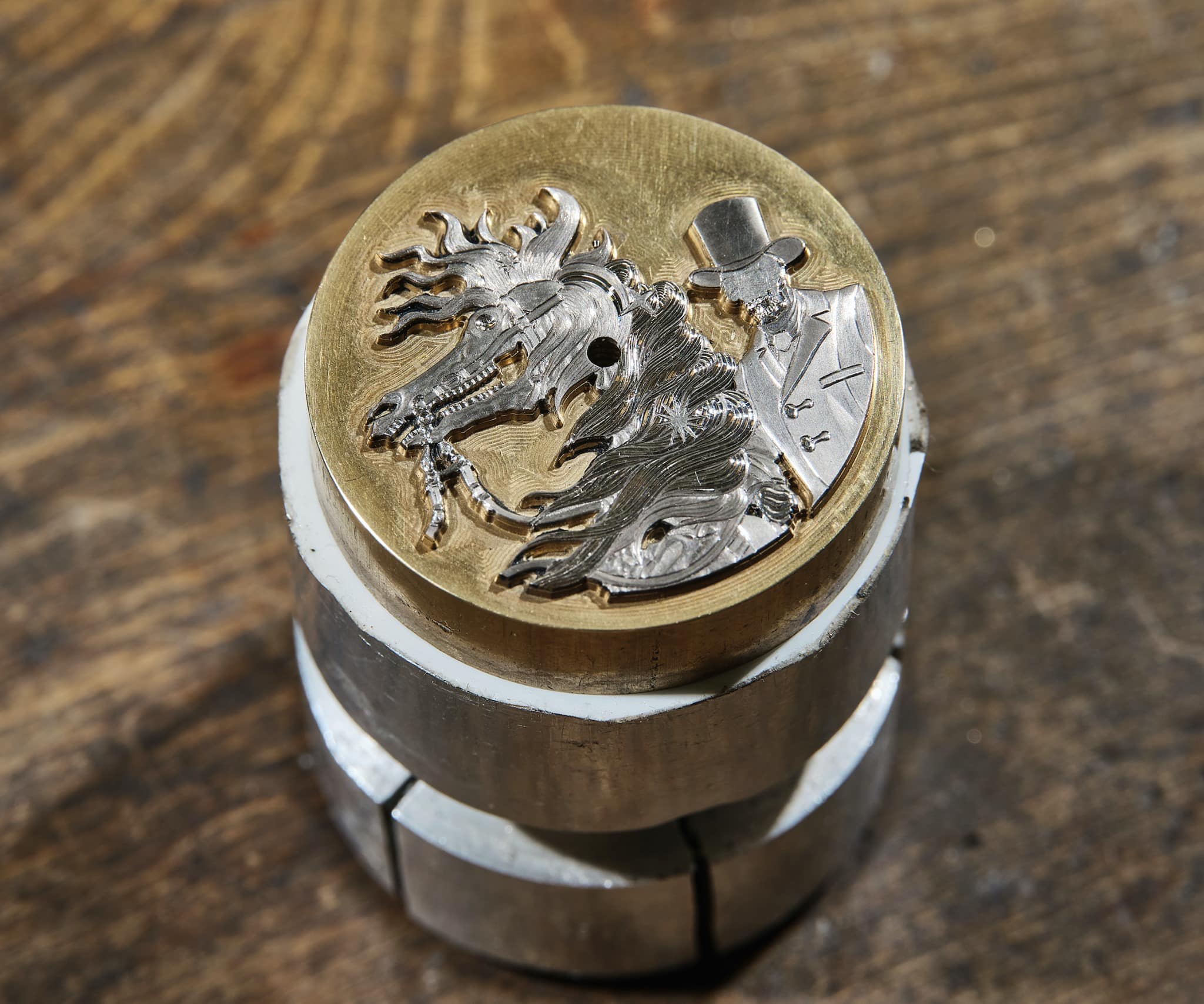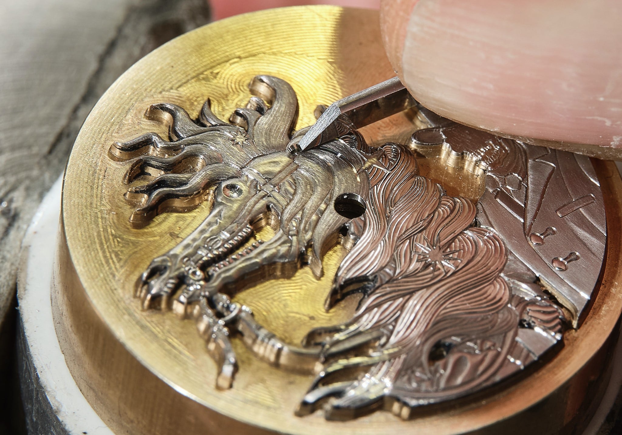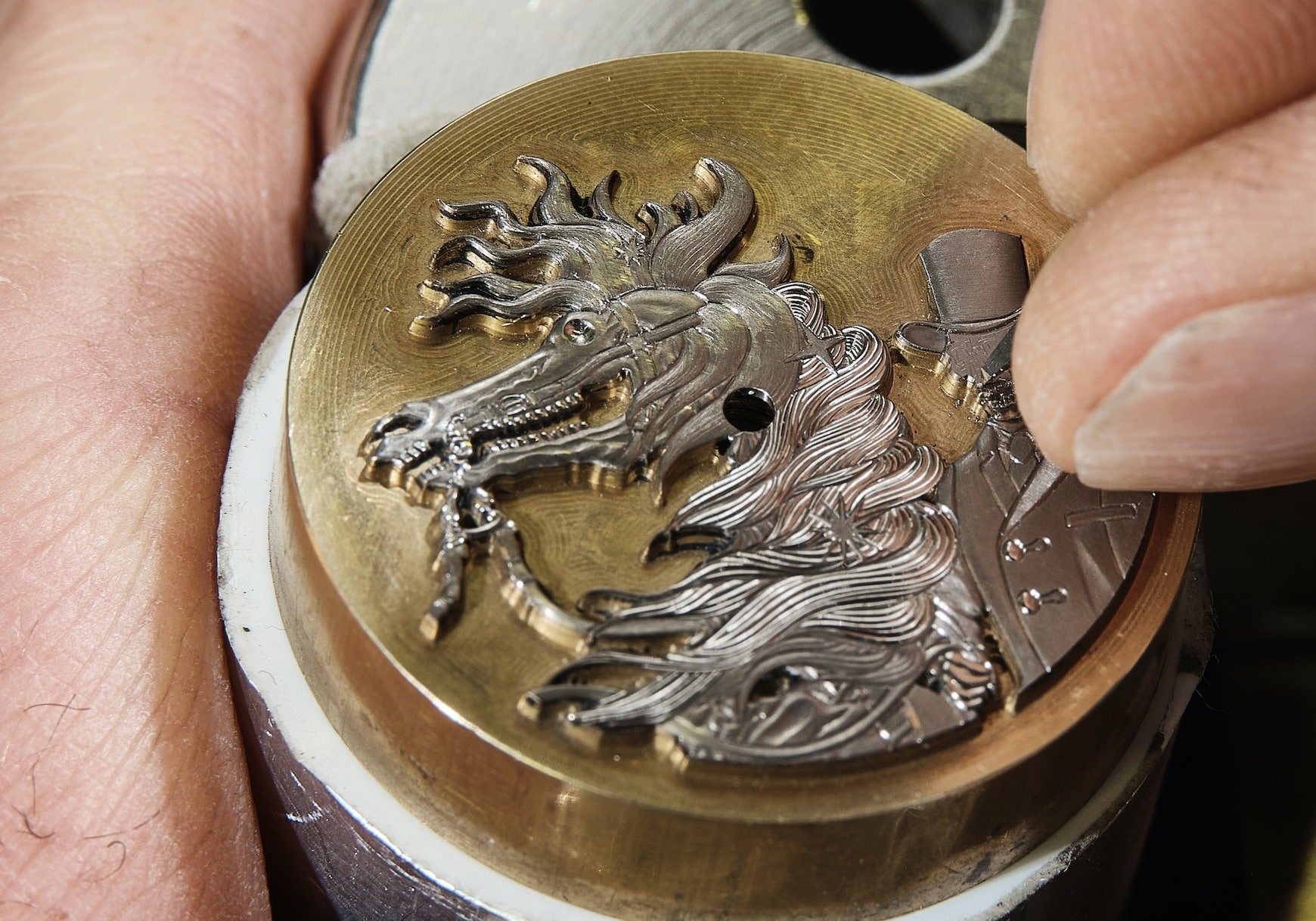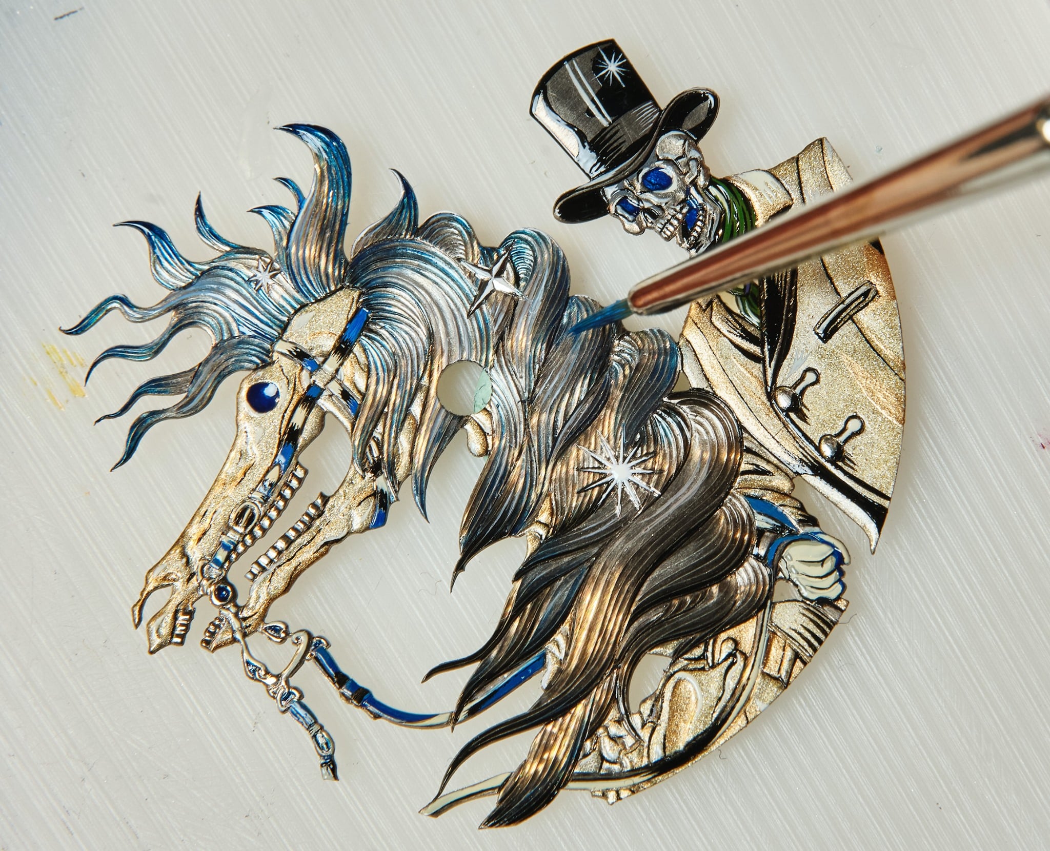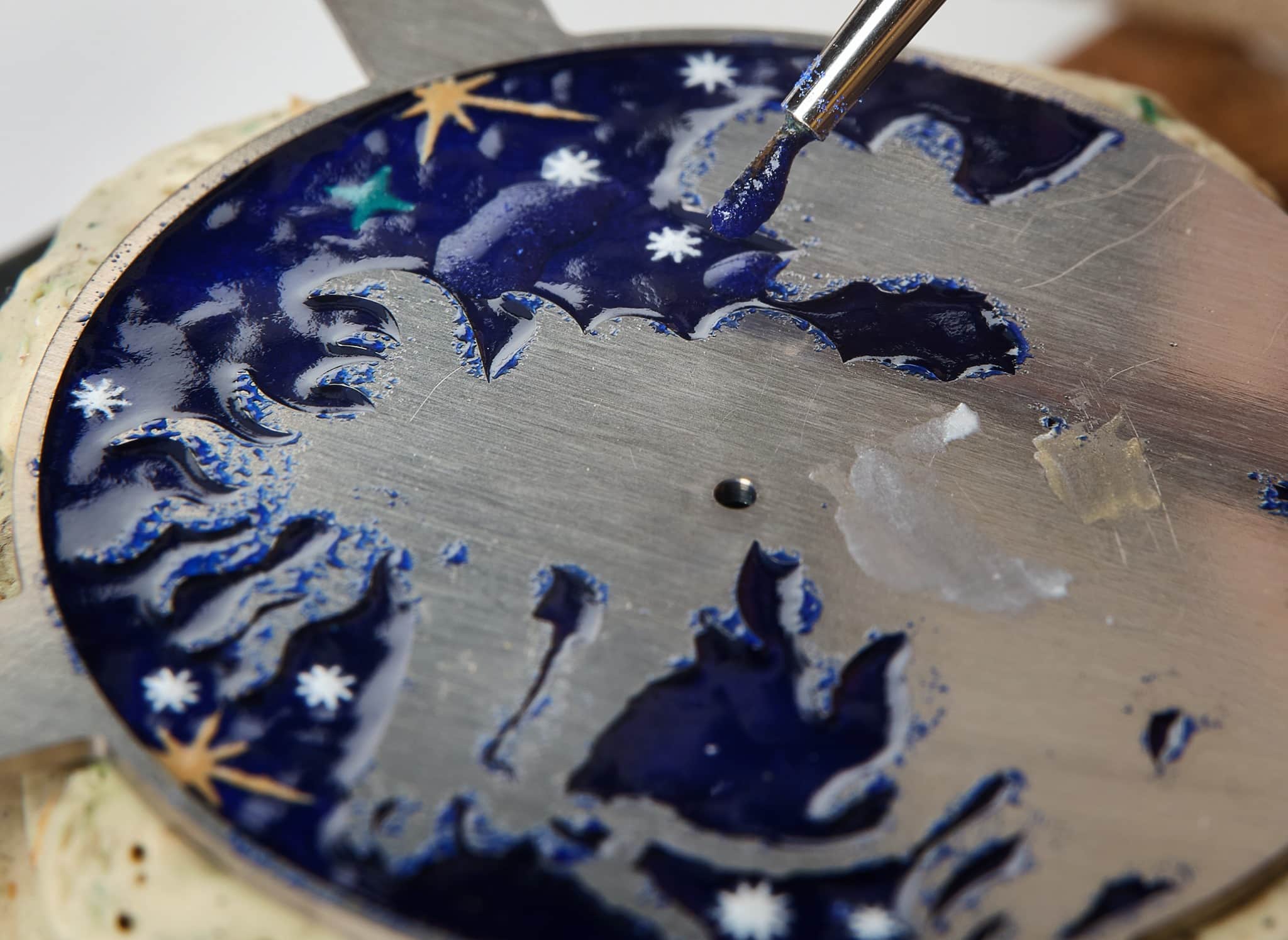 La carátula reúne varias técnicas, entre ellas la del esmalte pailloné, que consiste en insertar laminillas de oro o de plata entre las capas de esmalte para crear juegos de luz, transparencia y relieve. El artesano procede a esta operación delicada atendiendo a otra tarea que exige idéntica destreza: el esmalte miniatura. Traza los contornos del motivo en una superficie esmaltada y pulida a mano; después, con un pincel muy fino, deposita polvos de vidrio de color mezclados con aceites naturales.