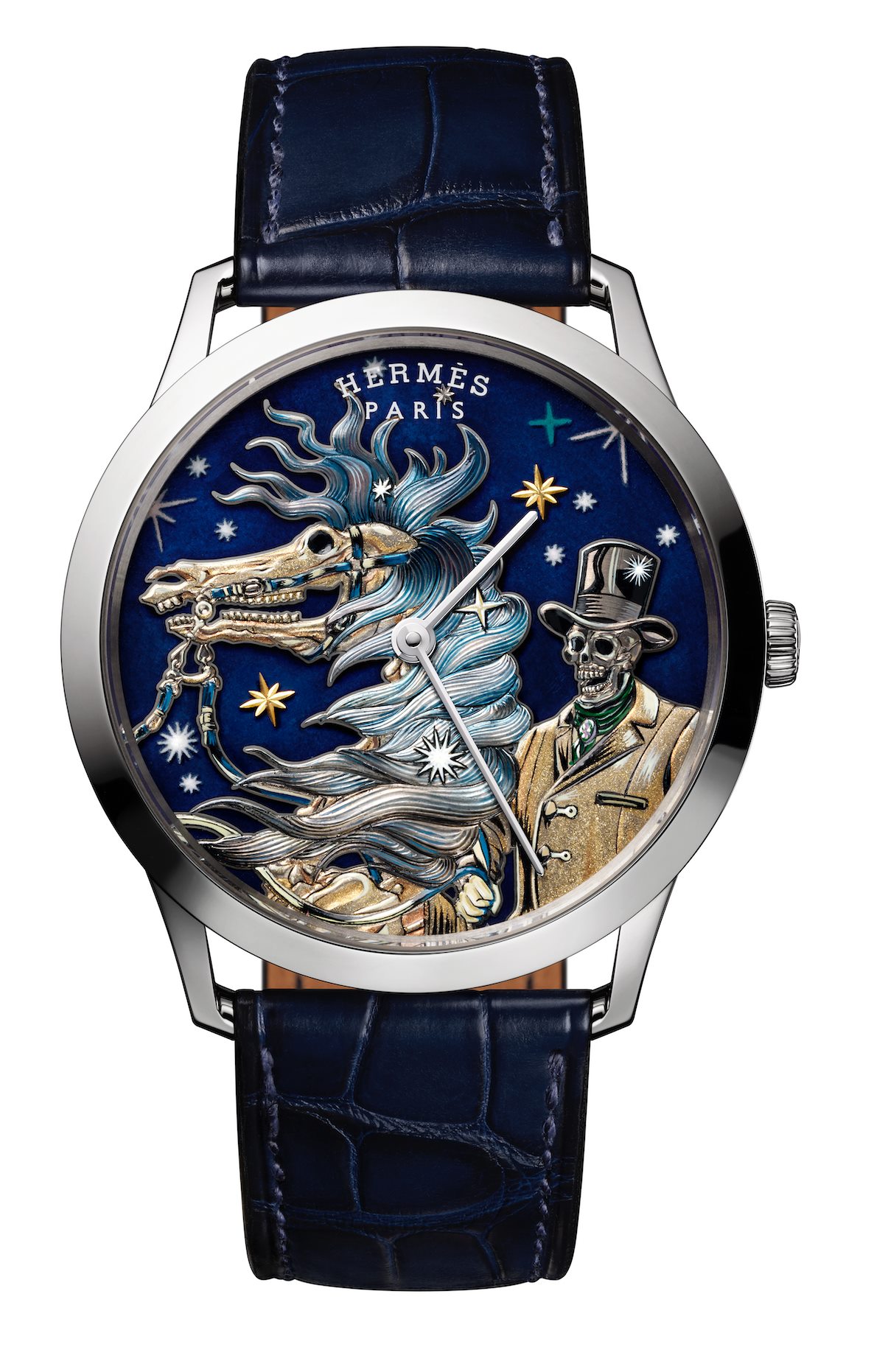 El motivo de la carátula presenta el esqueleto de un jinete con frac y chistera cabalgando una montura briosa; procede de un pañuelo masculino diseñado en 2012 por Daiske Nomura. A este diseñador e ilustrador japonés le gusta dar un giro a los emblemas de la Maison Hermès acercándolos a la cultura de los dibujos animados, los manga o los juegos de vídeo; la suya es una visión original o futurista, siempre inesperada.
