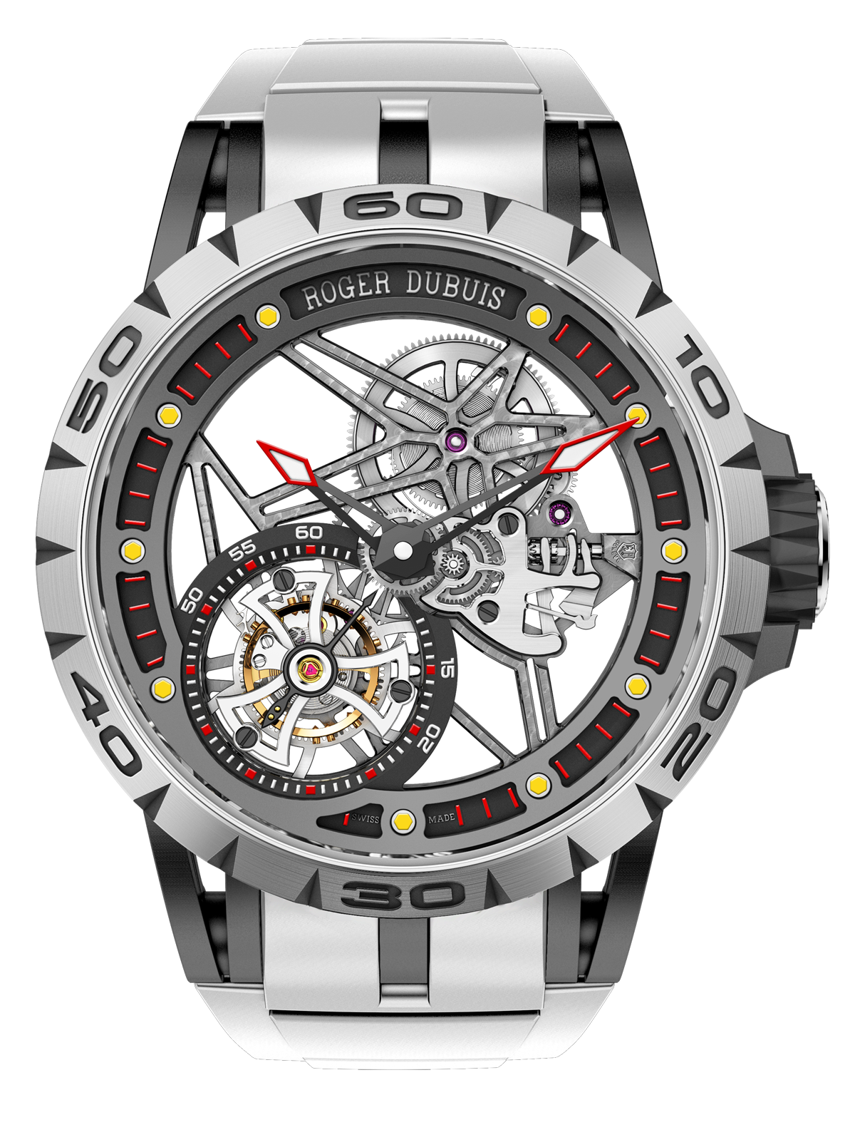 Caja de 45 mm de titanio, esqueletada y cuya carrura ha sido construida en titanio con tratamiento DLC, negro. Asimismo, su carátula calada presenta realces negros y minutería blanca con el emblema de Roger Dubuis. Sus tornillos de titanio vienen recubiertos de SuperLumiNova®, al igual que sus agujas, y su hermeticidad es de 50 metros. Se abraza a la muñeca mediante una correa de caucho negro con hebilla desplegable de titanio, mientras que late a partir de la frecuencia dada por el calibre de cuerda manual RD505SQ sellado con el Punzón de Ginebra.