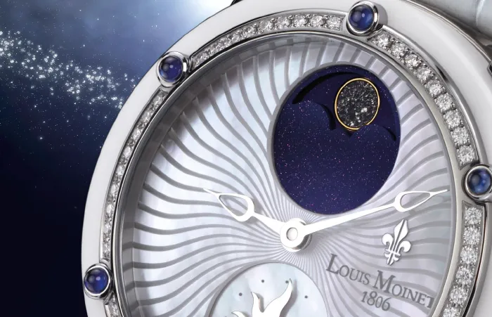 La carátula del Stardance, elaborada en madre-perla luce el característico guilloche Côtes de Jura de Louis Moinet y presenta los universos gemelos del día (Sol) y la noche (Luna).