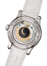 La noche es evocada por el deslumbrante indicador de fase lunar ubicado a las 12 en punto, creado a partir del fragmento del meteorito Enstatite EH3. El día es representado por un Sol plateado ubicado dentro del segundero pequeño a las 6 horas. Además, su bisel está engastado con 6 zafiros corte cabuchón y la caja elaborada en titanio titanio grado 5 lo que la hace ligera y confortable.