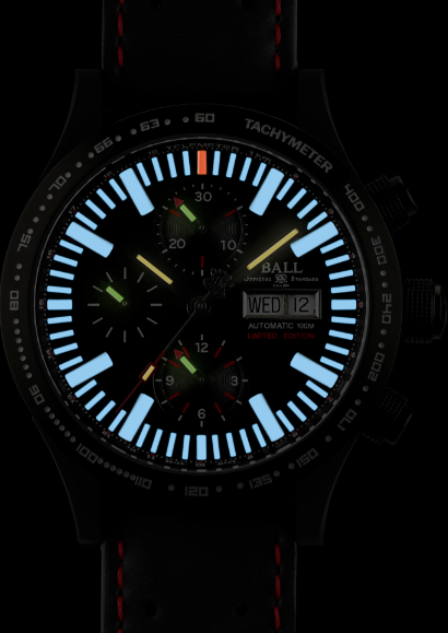 El Storm Chaser DLC Glow posee un movimiento mecánico automático cronógrafo suizo muy preciso que además de indicar las horas, los minutos, los segundos, el día y la fecha, ofrece un taquímetro mediante el cual el usuario puede medir la velocidad a la que se ha recorrido una distancia determinada, así como un telémetro que permite medir fácilmente la distancia entre el observador y una situación observable tanto de manera visual como sonora (rayos y truenos), basándose en la velocidad a la que el sonido atraviesa el aire. Ambas escalas constituyen una herramienta vital para los “cazadores de tormentas” aficionados y profesionales como el famoso Dr. Josh Wurman, a quien BALL Watches ha dedicado esta extraordinaria pieza relojera.