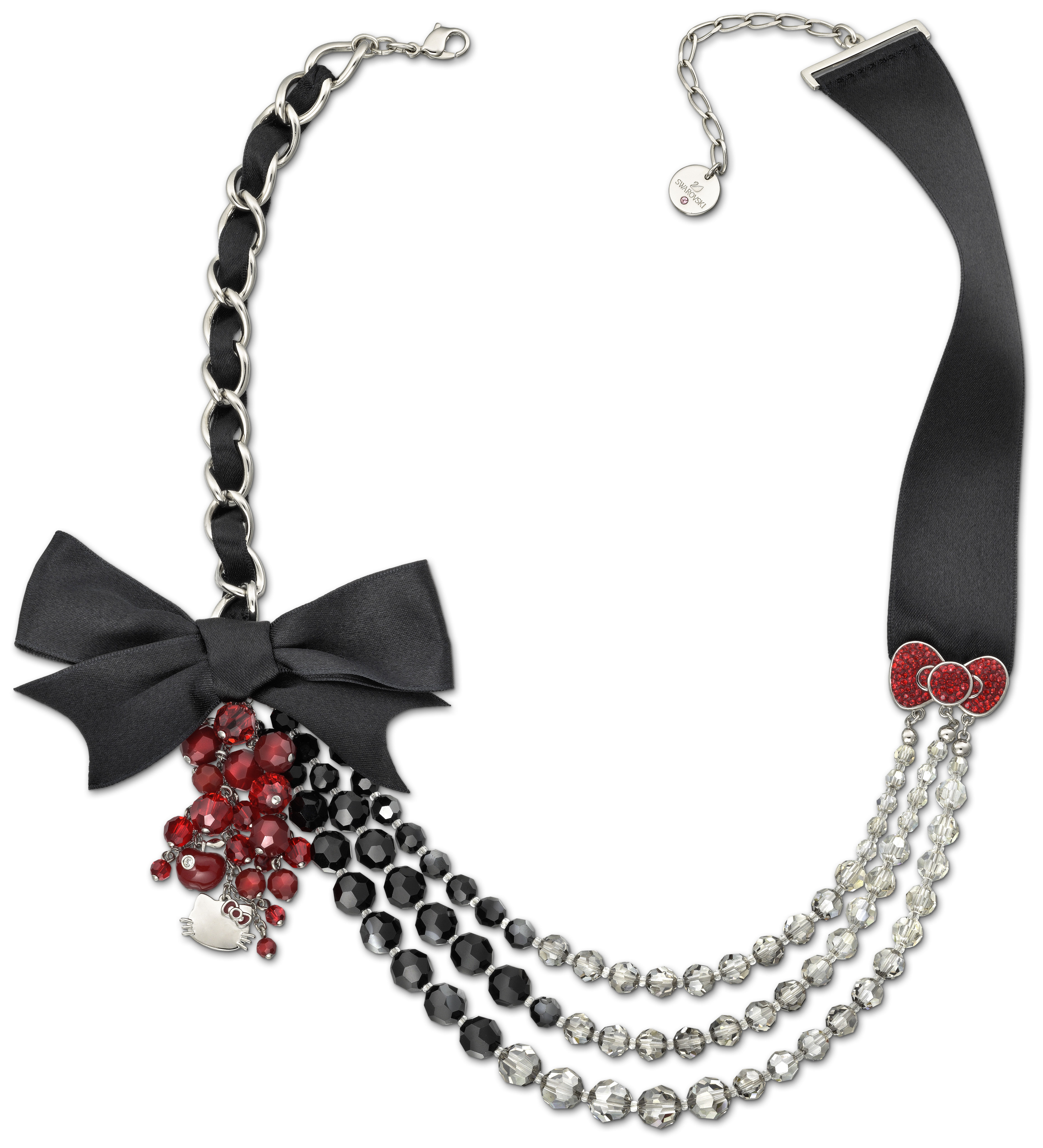 WW-VERANO 2012. La combinación perfecta entre seda, cristales y gradación de colores -desde el negro al transparente-, domina en el magnífico diseño asimétrico de este collar y cadena. Asimismo, la colección Glamour presenta una pulsera de tres vueltas y un par de aretes adornados con delicadas manzanas de cristal color rojo, acompañados de piedras negras y transparentes. La firma austriaca -con su novedosa colección 2012- lanza un conjunto de piezas frescas y delicadas, las cuales brindarán alegría a las fans de Hello Kitty alrededor del mundo.
