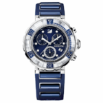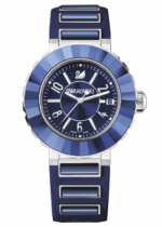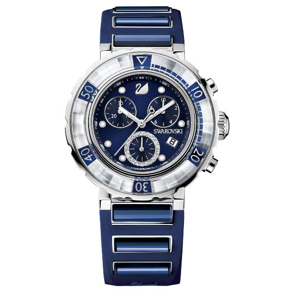 Gracias al mecanismo ETA de su cronógrafo, OCTEA chrono es sinónimo de alta precisión y máximo rendimiento. La combinación de correas de caucho y cristales tono sobre tono de la marca continúa y este reloj, deportivo al tiempo que femenino, está ahora disponible en un elegante tono azul oscuro, creando un contraste sorprendente con los marcadores de índice LumiNova® en la manecilla indicadora de la hora y el minutero. La esfera incluye 3 manecillas que indican los minutos, los segundos y las décimas de segundo, y una de las manecillas está adornada con cristal pavé para darle un aspecto más femenino.