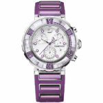 Caja: redonda de acero inoxidable, 39 mm de diámetro con un bisel facetado en cerámica blanca, cristal Amethyst Intensive Diamond Touch Light, cristal Jet Hematite o Crystal Silver Night.