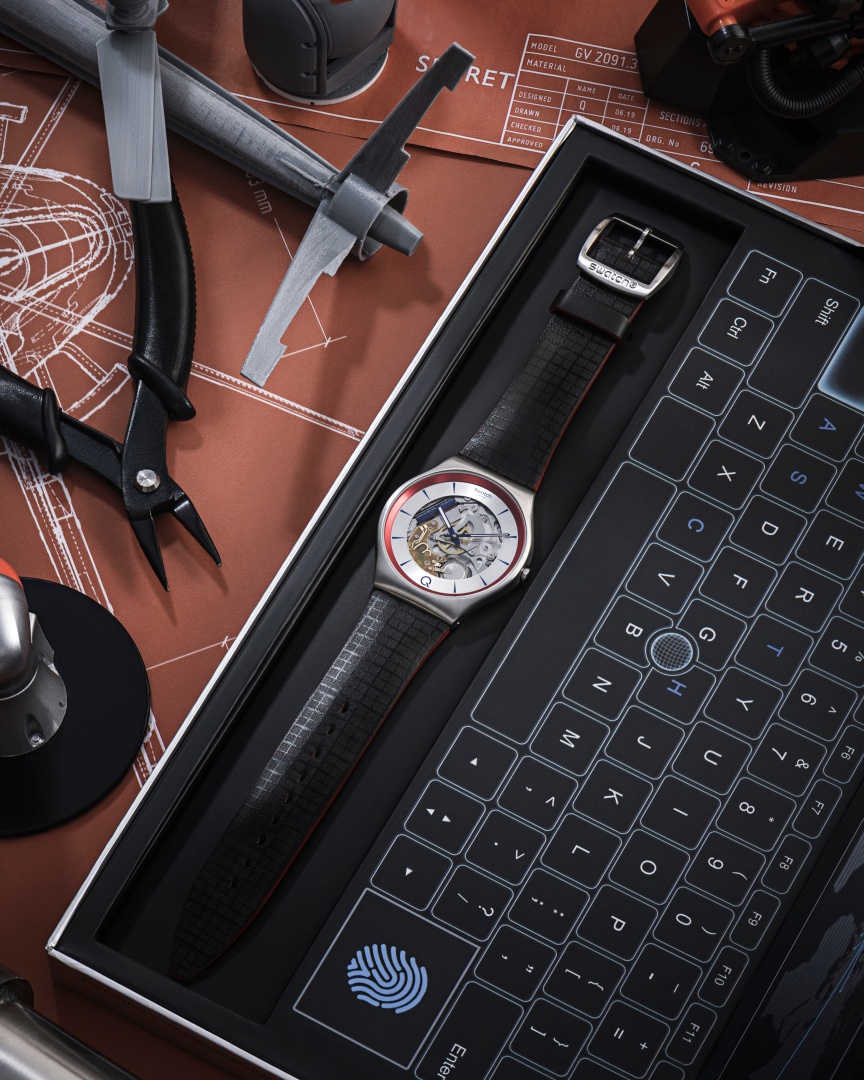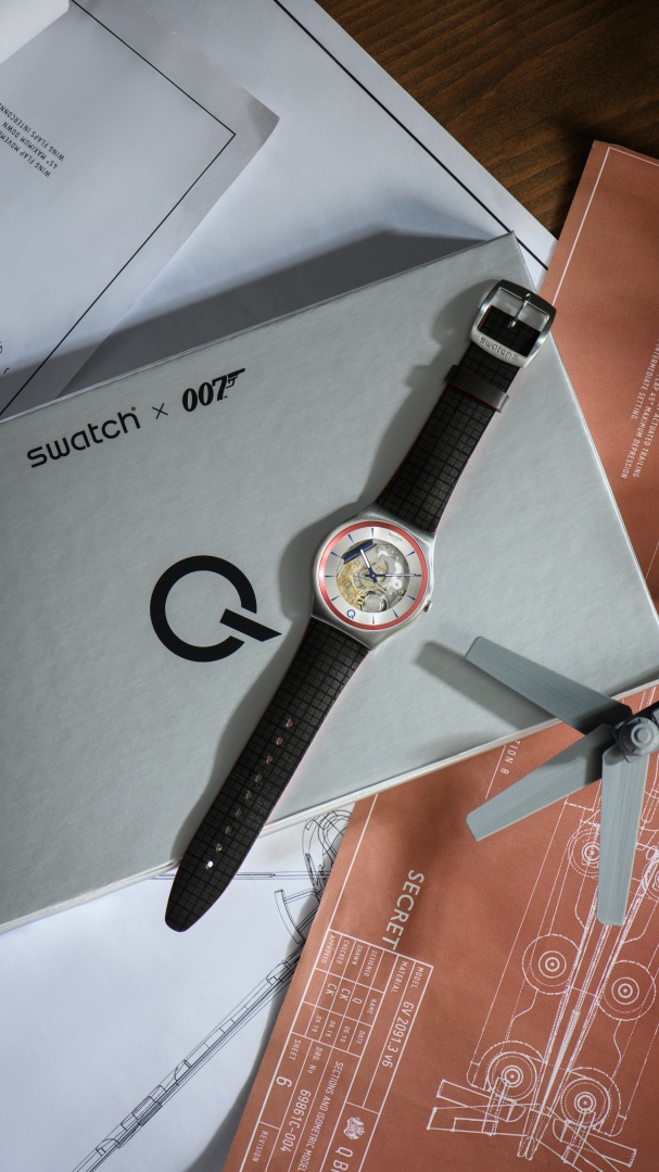Se presenta la nueva versión de Swatch en exclusiva para el filme del 007 No time to die, que llegará a las salas de cine en noviembre. Q es el personaje favorito de la marca, por lo que desarrolla un misterioso reloj inspirado en el laboratorio de Q.