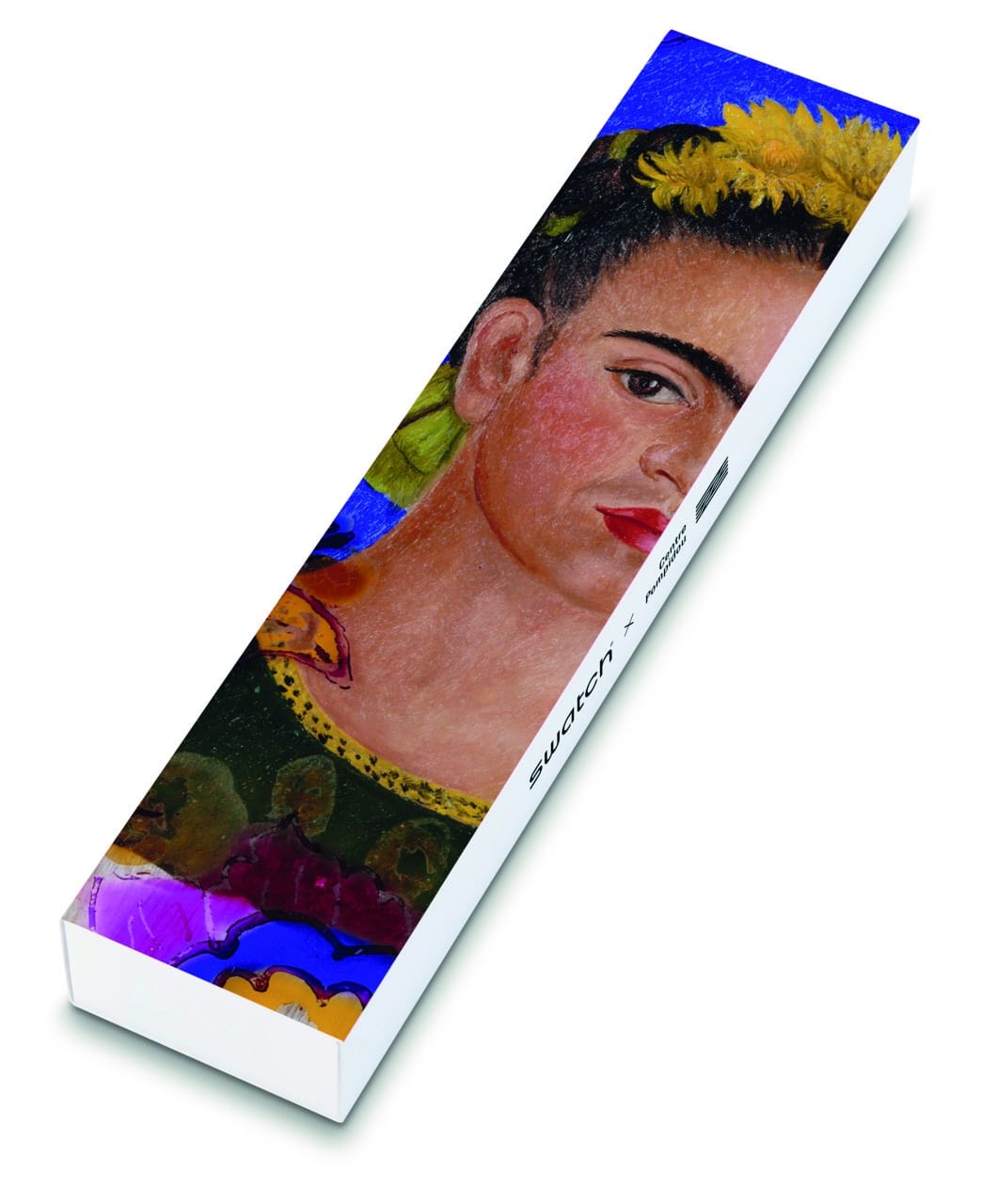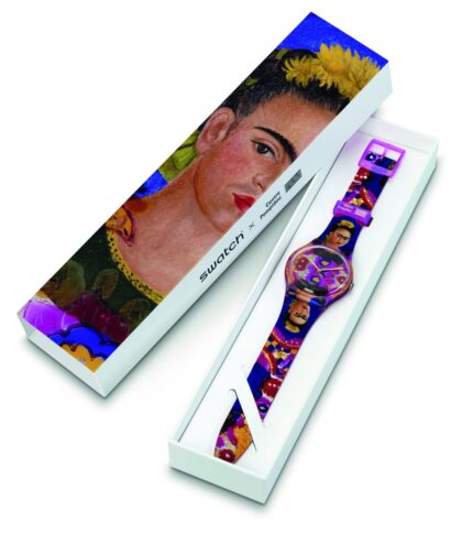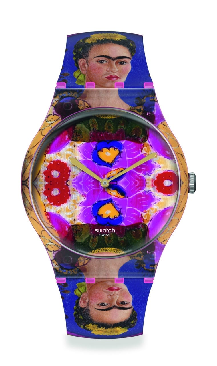 Swatch reinventa uno de los autorretratos más famosos de la artista mexicana creando una imagen especular perfectamente dividida entre las 6 y las 12 de la carátula. Los colores intensos y alegres de El Marco aparecen en el anverso del reloj NEW Gent, perfectamente equilibrados gracias al color rosa de la base y la parte inferior de la correa.