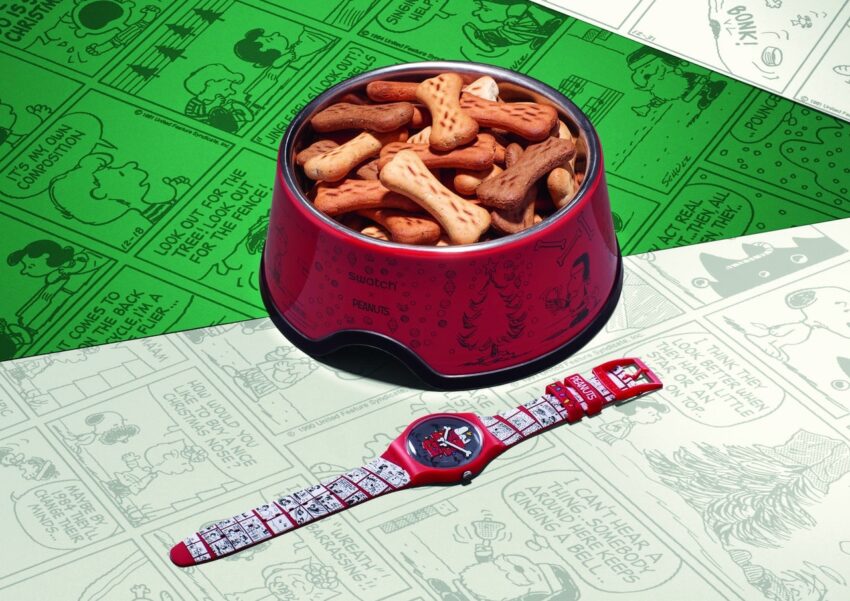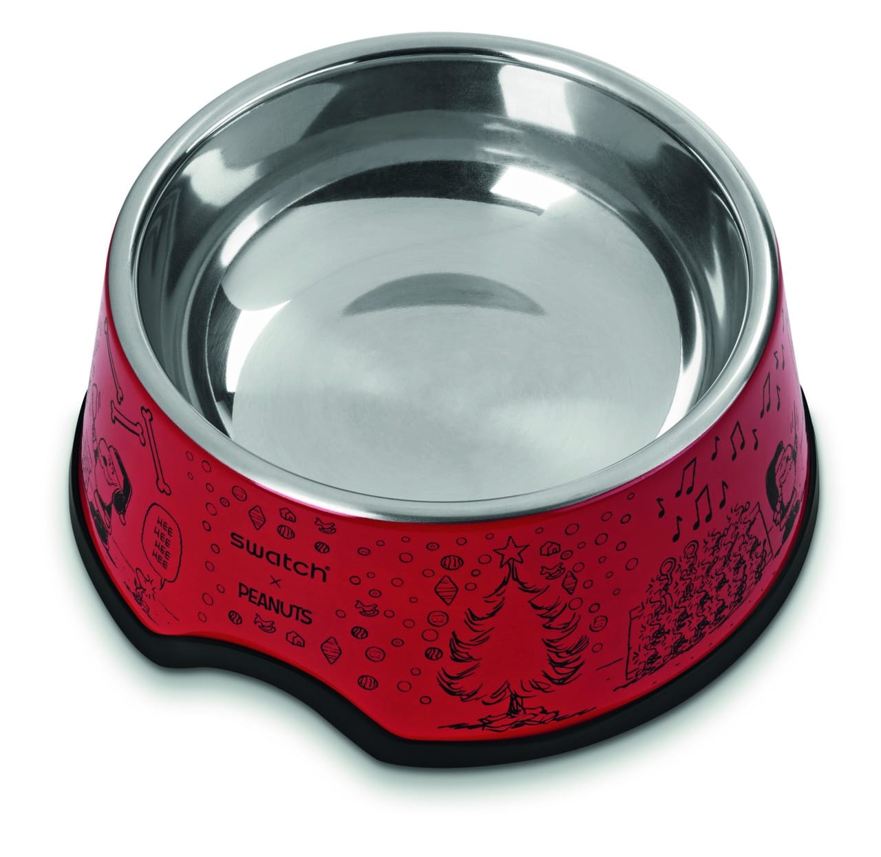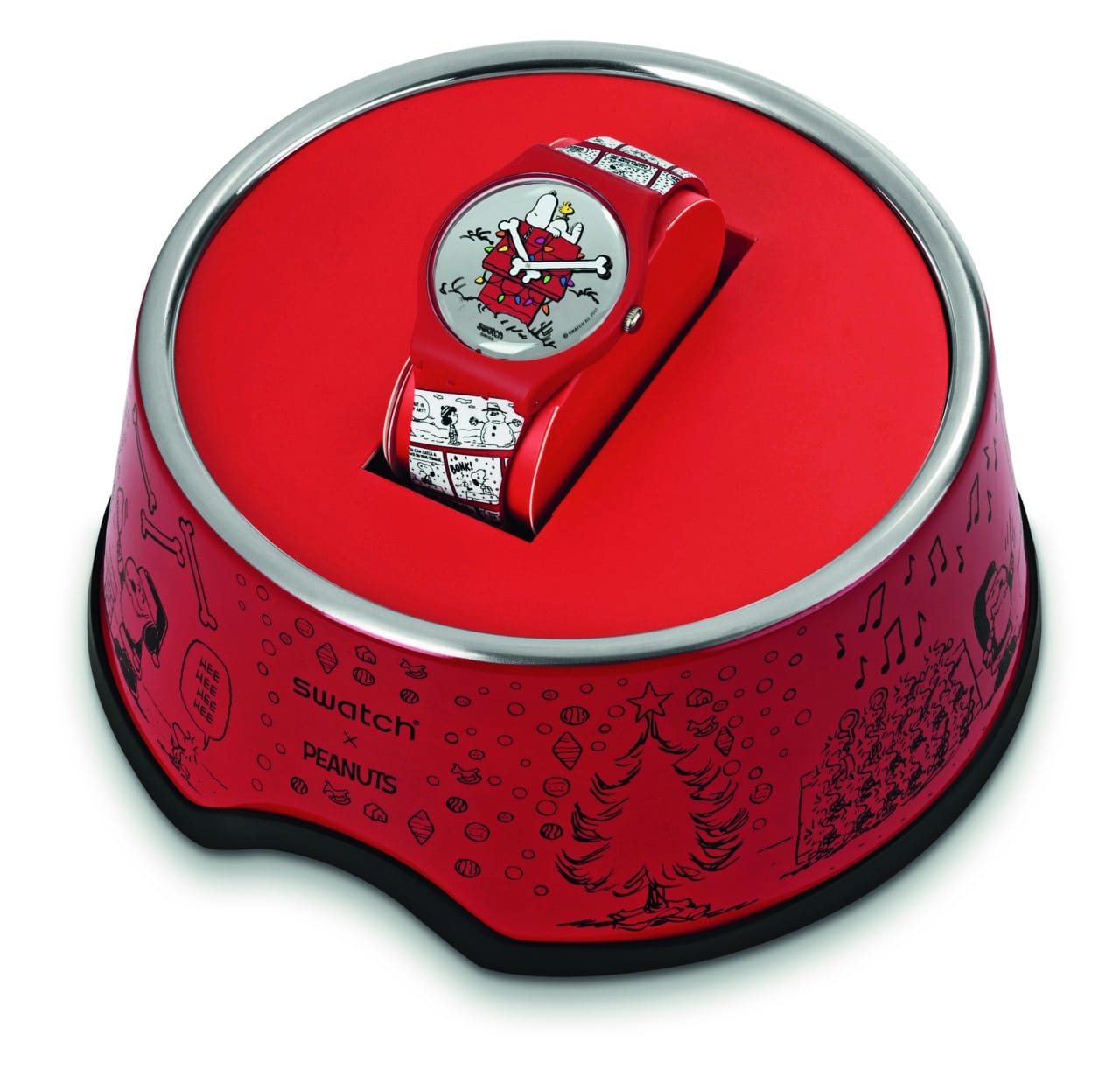 En esta edición Swatch x Peanuts Holiday Special, el plato para mascotas rojo está decorado con dibujos de su creador Schulz, con árboles de navidad, huesos de perro y por su puesto con los personajes de Peanuts jugando en la nieve.
