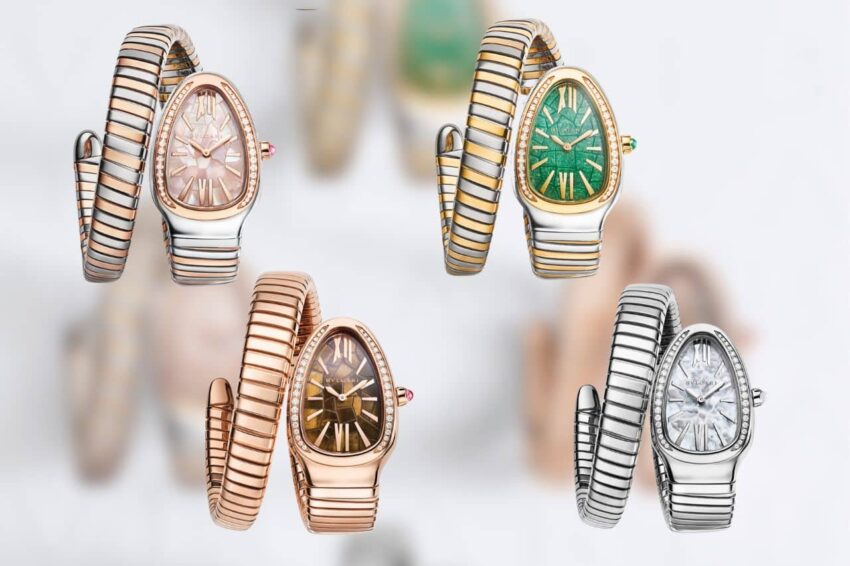 Por primera vez la colección Serpenti Tubogas de Bulgari cuenta con una colaboración artística para sus ejecuciones. Es el talento del arquitecto nipón Tadao Ando el que transformó la esfera del icónico reptil empleando aventurina verde, ojo de tigre y madreperla blanca o rosa, colores con los que representa la cuatro estaciones.