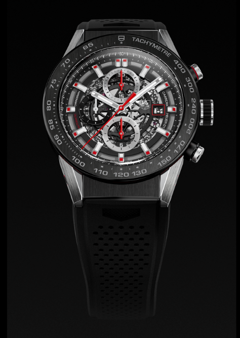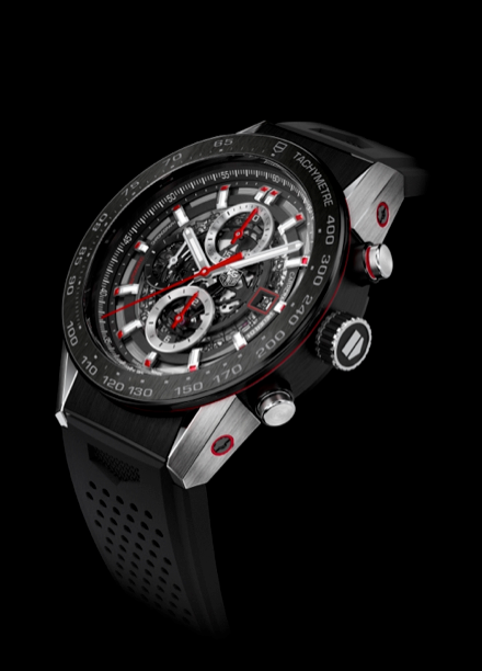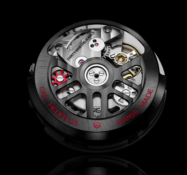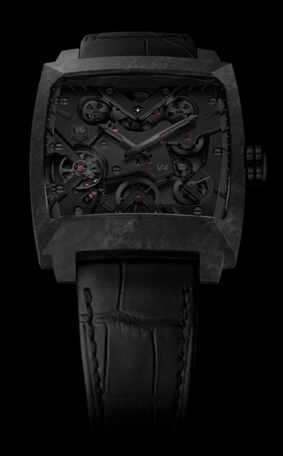 Tras la solución al problema de la transmisión de la energía por bandas, TAG Heuer demostró su gran poder de innovación, y años más tarde le dotó de un torbellino. Sin embargo, en esta ocasión se ha utilizado un material extraordinario para dar vida “y oscuridad” al V4, pues se exhibe en una coloración negro mate.