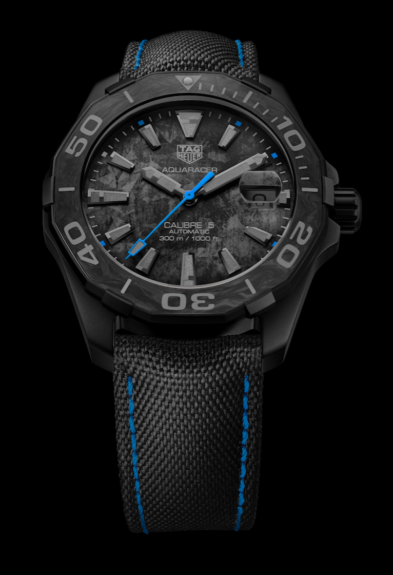 Desarrollados a partir de carbono, los modelos Aquaracer Carbone se distinguen por habitar en una caja de 41 mm de titanio revestido de PVD negro con toques sutiles de oro rosa, azules o amarillos que hacen contraste con el bisel de carbono.