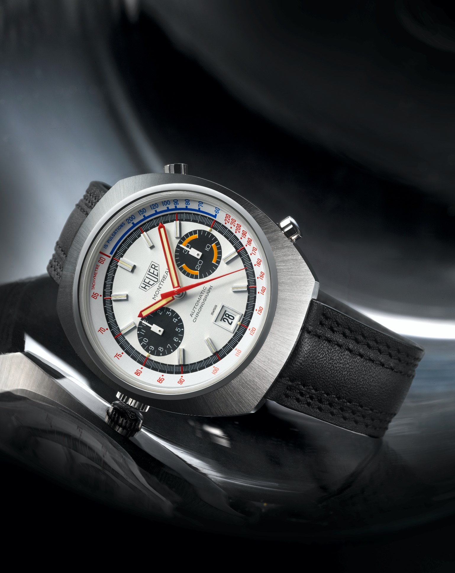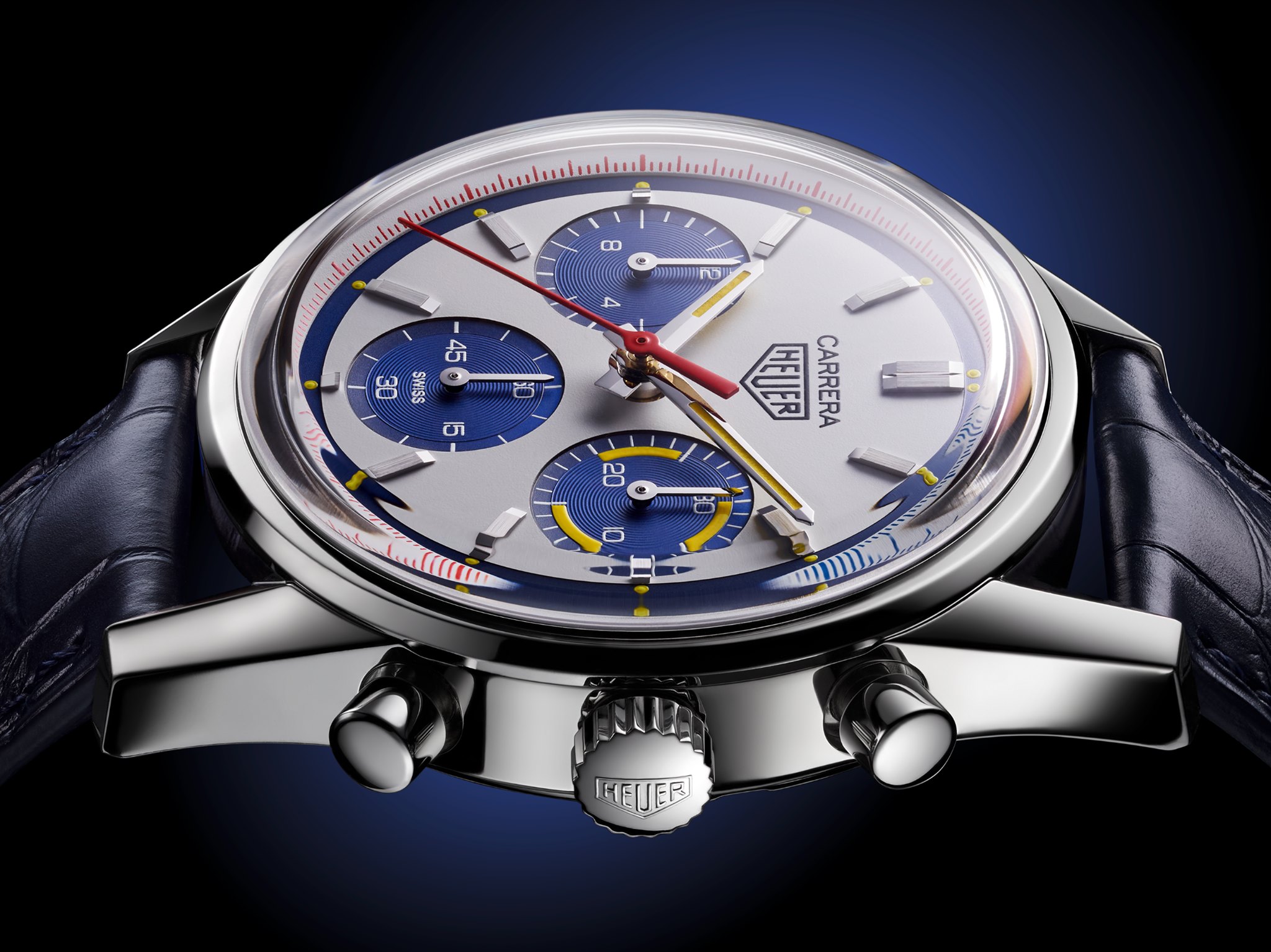 Retoma la estética para presentar una carátula en color blanco mate con totalizadores en efecto azurage, azulados tipo panda. Además, el contador de minutos –3 h– luce tres líneas curvas recubiertas de Super-LumiNova amarillo; la aguja trotadora de cronógrafo se exhibe en rojo y las horas y minutos también reciben este luminova. La escala juega con el rojo y el azul, mientras que un sutil punto de Super-LumiNova amarillo se posiciona al borde de los índices aplicados, logrando un diseño histórico y bellísimo, tanto de día como de noche. Remata el conjunto la inscripción Carrera Heuer con el logo original en punto de las 12 horas.
